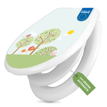 FUNKTION:Mit dem banjado Familien WC Sitz mit Absenkautomatik und dem Motiv Motiv Drei Bäume verbinden Sie Design mit Funktionalität. Sie erhalten den Toilettendeckel in bewährt guter Qualität mit Montagematerial passend auf alle Euro-WC-Becken. Die Gesamtgröße beträgt 37,1cm x 44,9cm x 5cm, die Grundfarbe ist weiß.</p> DESIGN:Der Klodeckel in weiß mit Motiv Motiv Drei Bäume hat eine ansprechende Optik, eine besondere Form und ist sehr stabil. Das Motiv besteht aus einer farbbrillianten Motivfolie, die durch ein Schutzlaminat zusätzlich vor Kratzern schützt. Der integrierte Kindersitz fügt sich harmonisch ein. DETAILS:Der Toilettensitz mit Soft Close besteht aus hochwertigem Polypropylen, ist geruchlos, ungiftig und kann mit handelsüblicher Seife gereinigt werden. Die Montage kann von von oben oder von unten erfolgen und ist kinderleicht. NUTZEN:Mit Hilfe der detaillierten Aufbauanleitung ermöglichen wir eine schnelle und unkomplizierte Montage. Die banjado Klobrille ist universell geeignet für alle Euro-WC-Schüsseln. Der Kindersitz kann unkompliziert entfernt werden. BANJADO:Ihr WC-Deckel wird in Sachsen in einer kleinen Manufaktur von Hand veredelt. Die Motivfolie ist lösungsmittelfrei und schutzlaminiert für einen langen Halt. Wir wünschen viel Freude bei der Auswahl eines schönen Motivs.