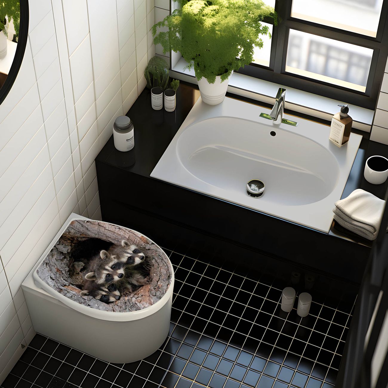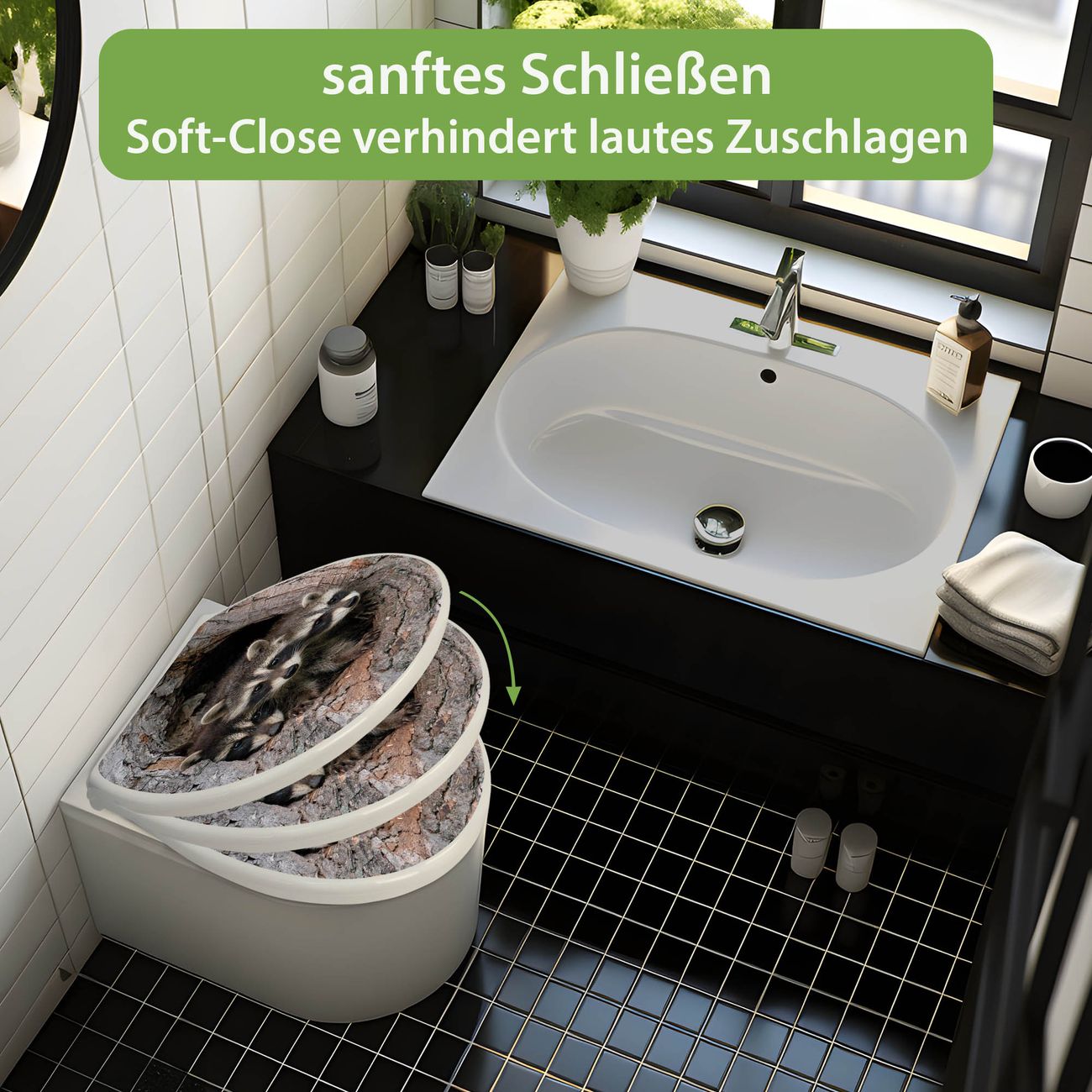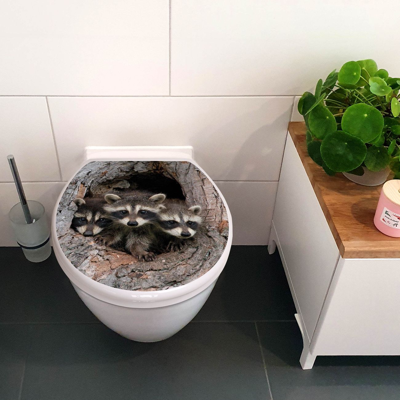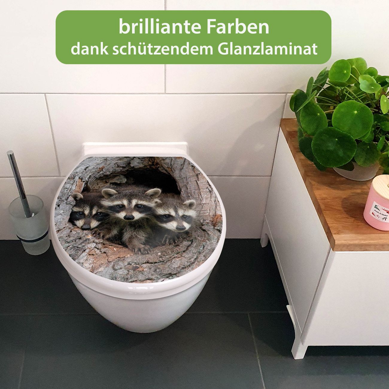 Toilettendeckel weiß mit Absenkautomatik Motiv Drei Waschbären