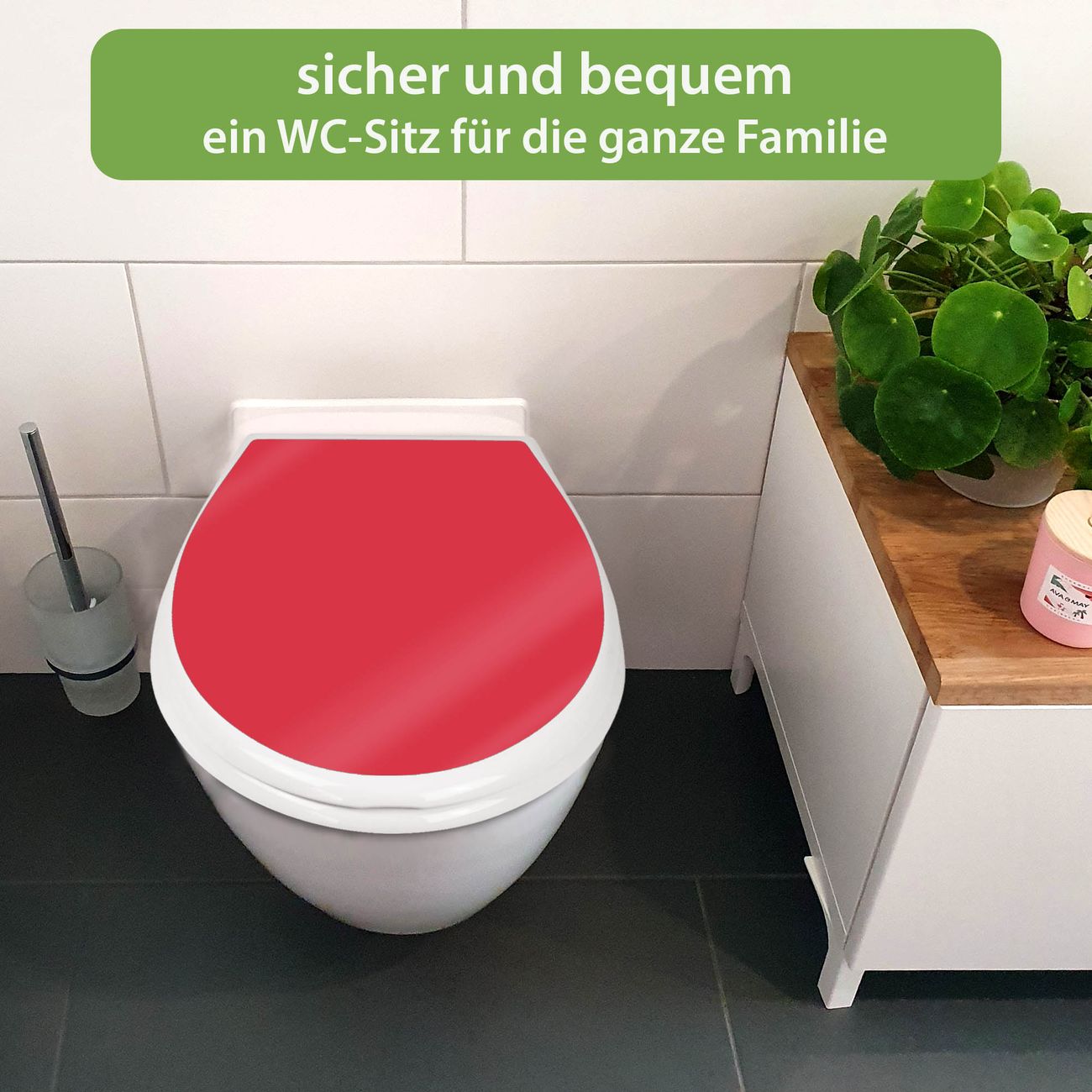 FUNKTION:Mit dem banjado Familien WC Sitz mit Absenkautomatik und dem Motiv Farbe Feuerrot verbinden Sie Design mit Funktionalität. Sie erhalten den Toilettendeckel in bewährt guter Qualität mit Montagematerial passend auf alle Euro-WC-Becken. Die Gesamtgröße beträgt 37,1cm x 44,9cm x 5cm, die Grundfarbe ist weiß.</p> DESIGN:Der Klodeckel in weiß mit Motiv Farbe Feuerrot hat eine ansprechende Optik, eine besondere Form und ist sehr stabil. Das Motiv besteht aus einer farbbrillianten Motivfolie, die durch ein Schutzlaminat zusätzlich vor Kratzern schützt. Der integrierte Kindersitz fügt sich harmonisch ein. DETAILS:Der Toilettensitz mit Soft Close besteht aus hochwertigem Polypropylen, ist geruchlos, ungiftig und kann mit handelsüblicher Seife gereinigt werden. Die Montage kann von von oben oder von unten erfolgen und ist kinderleicht. NUTZEN:Mit Hilfe der detaillierten Aufbauanleitung ermöglichen wir eine schnelle und unkomplizierte Montage. Die banjado Klobrille ist universell geeignet für alle Euro-WC-Schüsseln. Der Kindersitz kann unkompliziert entfernt werden. BANJADO:Ihr WC-Deckel wird in Sachsen in einer kleinen Manufaktur von Hand veredelt. Die Motivfolie ist lösungsmittelfrei und schutzlaminiert für einen langen Halt. Wir wünschen viel Freude bei der Auswahl eines schönen Motivs.
