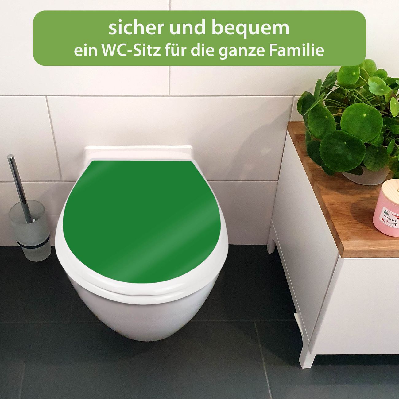 FUNKTION:Mit dem banjado Familien WC Sitz mit Absenkautomatik und dem Motiv Farbe Grün verbinden Sie Design mit Funktionalität. Sie erhalten den Toilettendeckel in bewährt guter Qualität mit Montagematerial passend auf alle Euro-WC-Becken. Die Gesamtgröße beträgt 37,1cm x 44,9cm x 5cm, die Grundfarbe ist weiß.</p> DESIGN:Der Klodeckel in weiß mit Motiv Farbe Grün hat eine ansprechende Optik, eine besondere Form und ist sehr stabil. Das Motiv besteht aus einer farbbrillianten Motivfolie, die durch ein Schutzlaminat zusätzlich vor Kratzern schützt. Der integrierte Kindersitz fügt sich harmonisch ein. DETAILS:Der Toilettensitz mit Soft Close besteht aus hochwertigem Polypropylen, ist geruchlos, ungiftig und kann mit handelsüblicher Seife gereinigt werden. Die Montage kann von von oben oder von unten erfolgen und ist kinderleicht. NUTZEN:Mit Hilfe der detaillierten Aufbauanleitung ermöglichen wir eine schnelle und unkomplizierte Montage. Die banjado Klobrille ist universell geeignet für alle Euro-WC-Schüsseln. Der Kindersitz kann unkompliziert entfernt werden. BANJADO:Ihr WC-Deckel wird in Sachsen in einer kleinen Manufaktur von Hand veredelt. Die Motivfolie ist lösungsmittelfrei und schutzlaminiert für einen langen Halt. Wir wünschen viel Freude bei der Auswahl eines schönen Motivs.