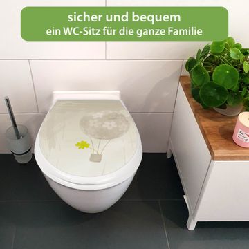 FUNKTION:Mit dem banjado Familien WC Sitz mit Absenkautomatik und dem Motiv Motiv Flüchtiges Glück verbinden Sie Design mit Funktionalität. Sie erhalten den Toilettendeckel in bewährt guter Qualität mit Montagematerial passend auf alle Euro-WC-Becken. Die Gesamtgröße beträgt 37,1cm x 44,9cm x 5cm, die Grundfarbe ist weiß.</p> DESIGN:Der Klodeckel in weiß mit Motiv Motiv Flüchtiges Glück hat eine ansprechende Optik, eine besondere Form und ist sehr stabil. Das Motiv besteht aus einer farbbrillianten Motivfolie, die durch ein Schutzlaminat zusätzlich vor Kratzern schützt. Der integrierte Kindersitz fügt sich harmonisch ein. DETAILS:Der Toilettensitz mit Soft Close besteht aus hochwertigem Polypropylen, ist geruchlos, ungiftig und kann mit handelsüblicher Seife gereinigt werden. Die Montage kann von von oben oder von unten erfolgen und ist kinderleicht. NUTZEN:Mit Hilfe der detaillierten Aufbauanleitung ermöglichen wir eine schnelle und unkomplizierte Montage. Die banjado Klobrille ist universell geeignet für alle Euro-WC-Schüsseln. Der Kindersitz kann unkompliziert entfernt werden. BANJADO:Ihr WC-Deckel wird in Sachsen in einer kleinen Manufaktur von Hand veredelt. Die Motivfolie ist lösungsmittelfrei und schutzlaminiert für einen langen Halt. Wir wünschen viel Freude bei der Auswahl eines schönen Motivs.