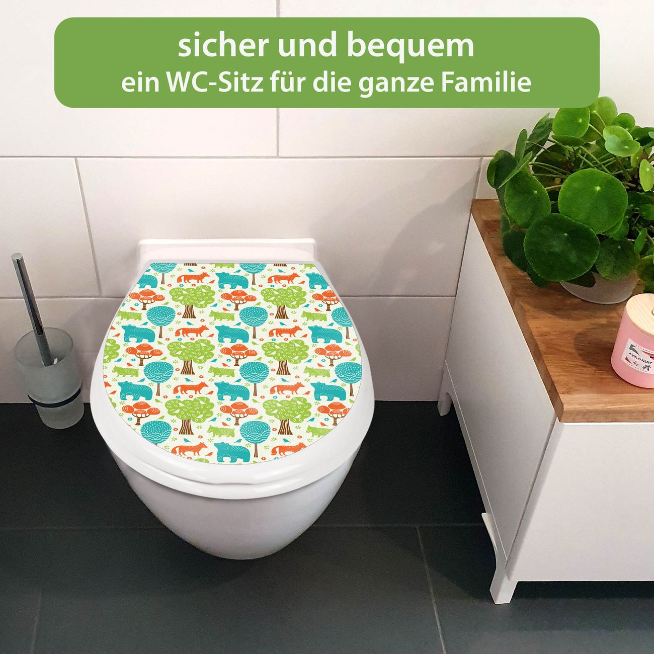 FUNKTION:Mit dem banjado Familien WC Sitz mit Absenkautomatik und dem Motiv Motiv Fuchs Bär Wald verbinden Sie Design mit Funktionalität. Sie erhalten den Toilettendeckel in bewährt guter Qualität mit Montagematerial passend auf alle Euro-WC-Becken. Die Gesamtgröße beträgt 37,1cm x 44,9cm x 5cm, die Grundfarbe ist weiß.</p> DESIGN:Der Klodeckel in weiß mit Motiv Motiv Fuchs Bär Wald hat eine ansprechende Optik, eine besondere Form und ist sehr stabil. Das Motiv besteht aus einer farbbrillianten Motivfolie, die durch ein Schutzlaminat zusätzlich vor Kratzern schützt. Der integrierte Kindersitz fügt sich harmonisch ein. DETAILS:Der Toilettensitz mit Soft Close besteht aus hochwertigem Polypropylen, ist geruchlos, ungiftig und kann mit handelsüblicher Seife gereinigt werden. Die Montage kann von von oben oder von unten erfolgen und ist kinderleicht. NUTZEN:Mit Hilfe der detaillierten Aufbauanleitung ermöglichen wir eine schnelle und unkomplizierte Montage. Die banjado Klobrille ist universell geeignet für alle Euro-WC-Schüsseln. Der Kindersitz kann unkompliziert entfernt werden. BANJADO:Ihr WC-Deckel wird in Sachsen in einer kleinen Manufaktur von Hand veredelt. Die Motivfolie ist lösungsmittelfrei und schutzlaminiert für einen langen Halt. Wir wünschen viel Freude bei der Auswahl eines schönen Motivs.