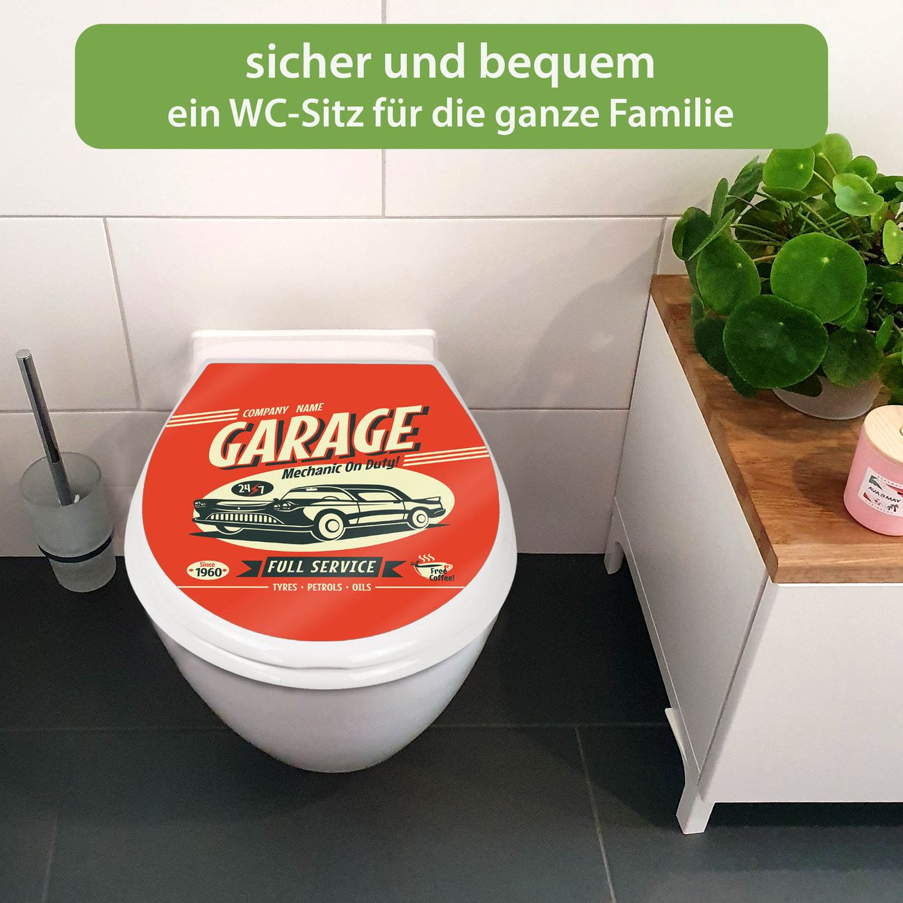 FUNKTION:Mit dem banjado Familien WC Sitz mit Absenkautomatik und dem Motiv Motiv Full Service verbinden Sie Design mit Funktionalität. Sie erhalten den Toilettendeckel in bewährt guter Qualität mit Montagematerial passend auf alle Euro-WC-Becken. Die Gesamtgröße beträgt 37,1cm x 44,9cm x 5cm, die Grundfarbe ist weiß.</p> DESIGN:Der Klodeckel in weiß mit Motiv Motiv Full Service hat eine ansprechende Optik, eine besondere Form und ist sehr stabil. Das Motiv besteht aus einer farbbrillianten Motivfolie, die durch ein Schutzlaminat zusätzlich vor Kratzern schützt. Der integrierte Kindersitz fügt sich harmonisch ein. DETAILS:Der Toilettensitz mit Soft Close besteht aus hochwertigem Polypropylen, ist geruchlos, ungiftig und kann mit handelsüblicher Seife gereinigt werden. Die Montage kann von von oben oder von unten erfolgen und ist kinderleicht. NUTZEN:Mit Hilfe der detaillierten Aufbauanleitung ermöglichen wir eine schnelle und unkomplizierte Montage. Die banjado Klobrille ist universell geeignet für alle Euro-WC-Schüsseln. Der Kindersitz kann unkompliziert entfernt werden. BANJADO:Ihr WC-Deckel wird in Sachsen in einer kleinen Manufaktur von Hand veredelt. Die Motivfolie ist lösungsmittelfrei und schutzlaminiert für einen langen Halt. Wir wünschen viel Freude bei der Auswahl eines schönen Motivs.
