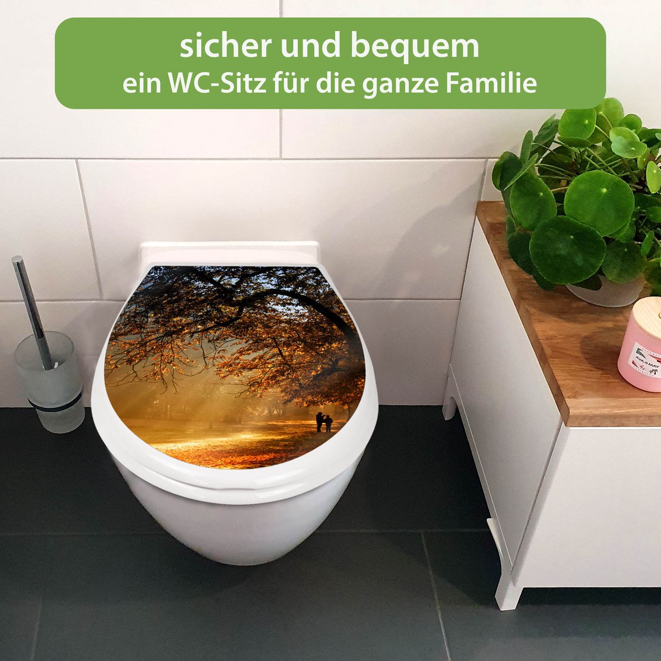FUNKTION:Mit dem banjado Familien WC Sitz mit Absenkautomatik und dem Motiv Motiv Goldener Herbst verbinden Sie Design mit Funktionalität. Sie erhalten den Toilettendeckel in bewährt guter Qualität mit Montagematerial passend auf alle Euro-WC-Becken. Die Gesamtgröße beträgt 37,1cm x 44,9cm x 5cm, die Grundfarbe ist weiß.</p> DESIGN:Der Klodeckel in weiß mit Motiv Motiv Goldener Herbst hat eine ansprechende Optik, eine besondere Form und ist sehr stabil. Das Motiv besteht aus einer farbbrillianten Motivfolie, die durch ein Schutzlaminat zusätzlich vor Kratzern schützt. Der integrierte Kindersitz fügt sich harmonisch ein. DETAILS:Der Toilettensitz mit Soft Close besteht aus hochwertigem Polypropylen, ist geruchlos, ungiftig und kann mit handelsüblicher Seife gereinigt werden. Die Montage kann von von oben oder von unten erfolgen und ist kinderleicht. NUTZEN:Mit Hilfe der detaillierten Aufbauanleitung ermöglichen wir eine schnelle und unkomplizierte Montage. Die banjado Klobrille ist universell geeignet für alle Euro-WC-Schüsseln. Der Kindersitz kann unkompliziert entfernt werden. BANJADO:Ihr WC-Deckel wird in Sachsen in einer kleinen Manufaktur von Hand veredelt. Die Motivfolie ist lösungsmittelfrei und schutzlaminiert für einen langen Halt. Wir wünschen viel Freude bei der Auswahl eines schönen Motivs.