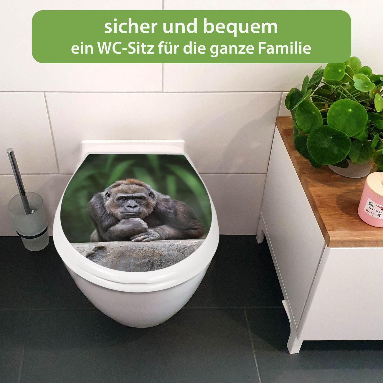 FUNKTION:Mit dem banjado Familien WC Sitz mit Absenkautomatik und dem Motiv Motiv Gorilla verbinden Sie Design mit Funktionalität. Sie erhalten den Toilettendeckel in bewährt guter Qualität mit Montagematerial passend auf alle Euro-WC-Becken. Die Gesamtgröße beträgt 37,1cm x 44,9cm x 5cm, die Grundfarbe ist weiß.</p> DESIGN:Der Klodeckel in weiß mit Motiv Motiv Gorilla hat eine ansprechende Optik, eine besondere Form und ist sehr stabil. Das Motiv besteht aus einer farbbrillianten Motivfolie, die durch ein Schutzlaminat zusätzlich vor Kratzern schützt. Der integrierte Kindersitz fügt sich harmonisch ein. DETAILS:Der Toilettensitz mit Soft Close besteht aus hochwertigem Polypropylen, ist geruchlos, ungiftig und kann mit handelsüblicher Seife gereinigt werden. Die Montage kann von von oben oder von unten erfolgen und ist kinderleicht. NUTZEN:Mit Hilfe der detaillierten Aufbauanleitung ermöglichen wir eine schnelle und unkomplizierte Montage. Die banjado Klobrille ist universell geeignet für alle Euro-WC-Schüsseln. Der Kindersitz kann unkompliziert entfernt werden. BANJADO:Ihr WC-Deckel wird in Sachsen in einer kleinen Manufaktur von Hand veredelt. Die Motivfolie ist lösungsmittelfrei und schutzlaminiert für einen langen Halt. Wir wünschen viel Freude bei der Auswahl eines schönen Motivs.