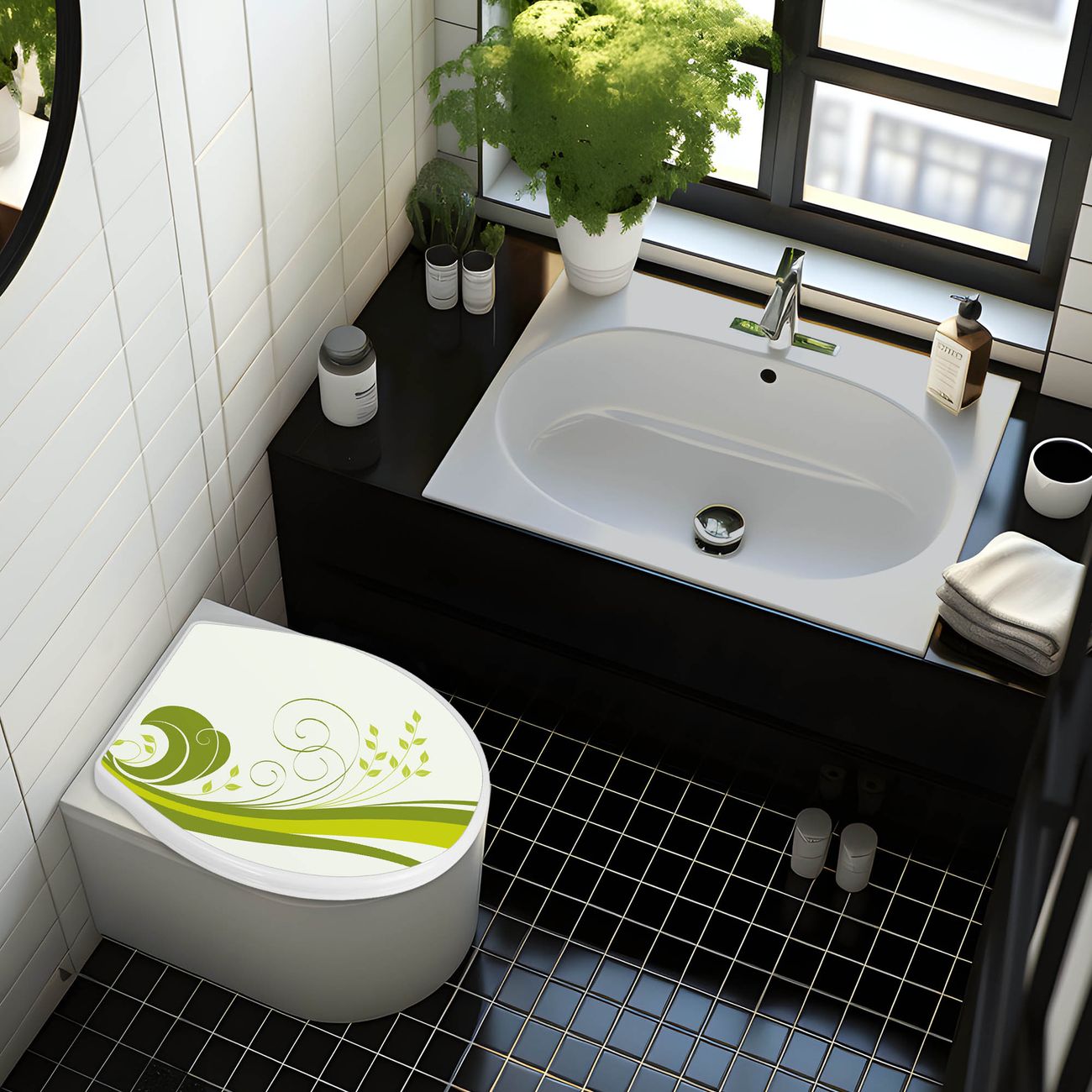FUNKTION:Mit dem banjado Familien WC Sitz mit Absenkautomatik und dem Motiv Green Swirl verbinden Sie Design mit Funktionalität. Sie erhalten den Toilettendeckel in bewährt guter Qualität mit Montagematerial passend auf alle Euro-WC-Becken. Die Gesamtgröße beträgt 37cm x 44,5cm x 5cm, die Grundfarbe ist weiß.</p> DESIGN:Der Klodeckel in weiß mit Motiv Green Swirl hat eine ansprechende Optik, eine besondere Form und ist sehr stabil. Das Motiv besteht aus einer farbbrillianten Motivfolie, die durch ein Schutzlaminat zusätzlich vor Kratzern schützt. Der integrierte Kindersitz fügt sich harmonisch ein. DETAILS:Der Toilettensitz mit Soft Close besteht aus hochwertigem Polypropylen, ist geruchlos, ungiftig und kann mit handelsüblicher Seife gereinigt werden. Die Montage kann von von oben oder von unten erfolgen und ist kinderleicht. NUTZEN:Mit Hilfe der detaillierten Aufbauanleitung ermöglichen wir eine schnelle und unkomplizierte Montage. Die banjado Klobrille ist universell geeignet für alle Euro-WC-Schüsseln. Der Kindersitz kann unkompliziert entfernt werden. BANJADO:Ihr WC-Deckel wird in Sachsen in einer kleinen Manufaktur von Hand veredelt. Die Motivfolie ist lösungsmittelfrei und schutzlaminiert für einen langen Halt. Wir wünschen viel Freude bei der Auswahl eines schönen Motivs.