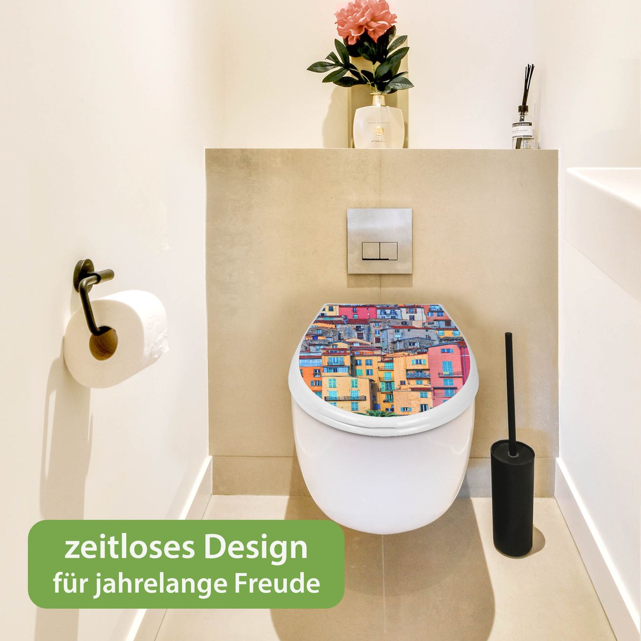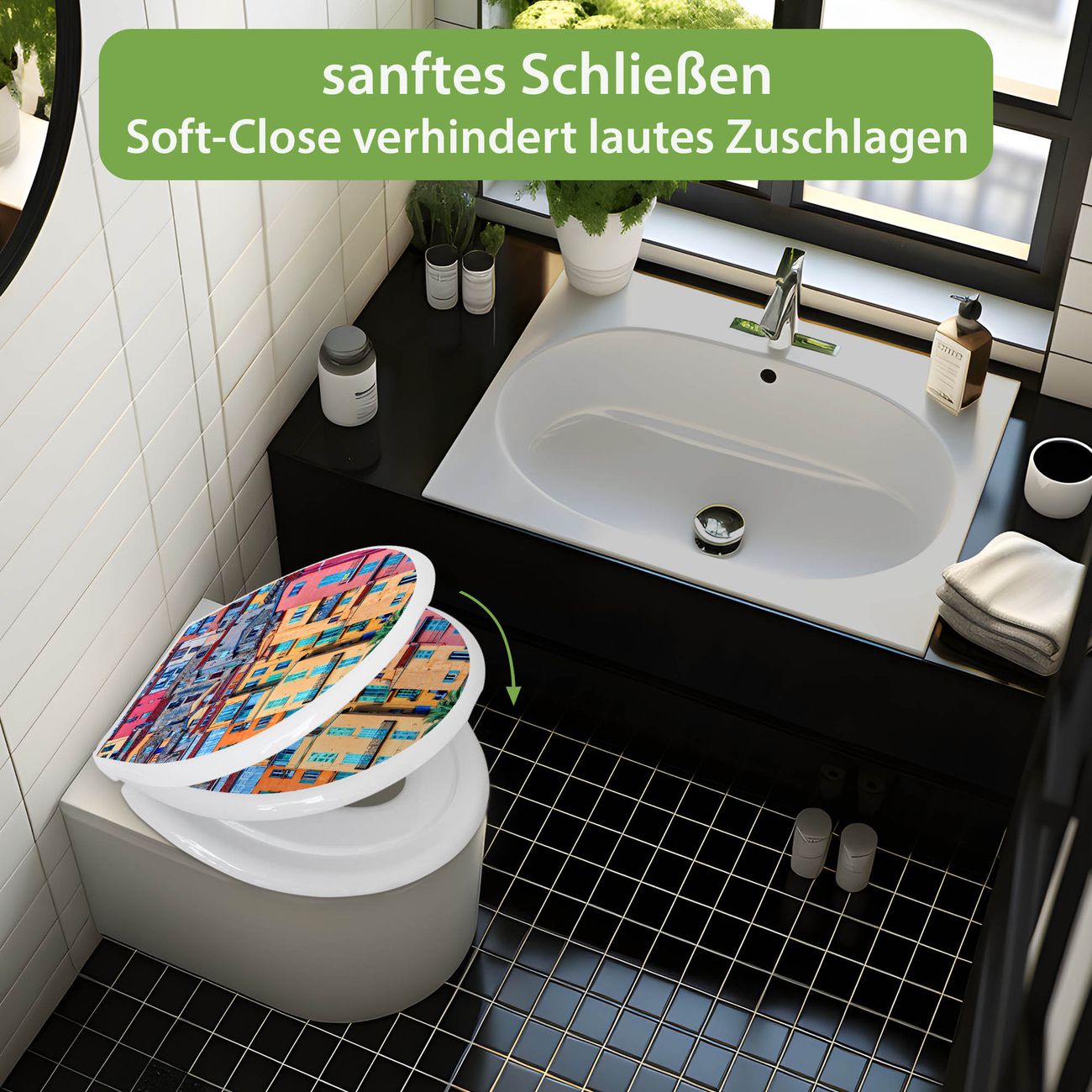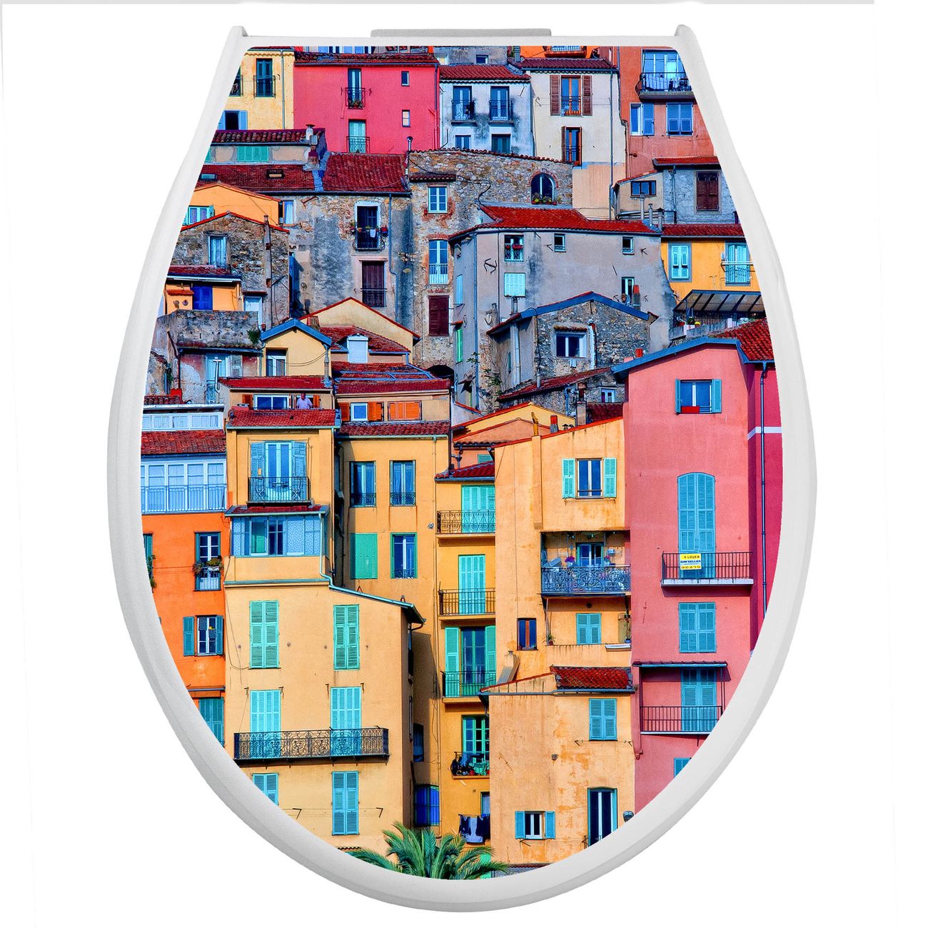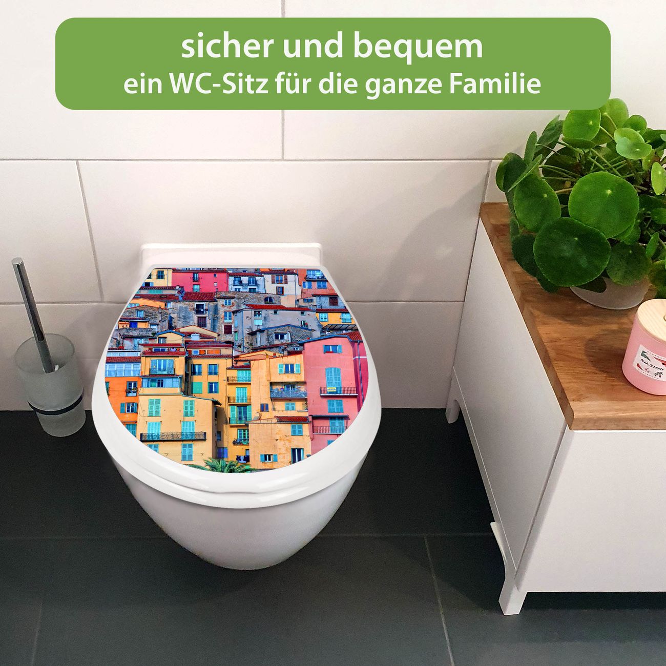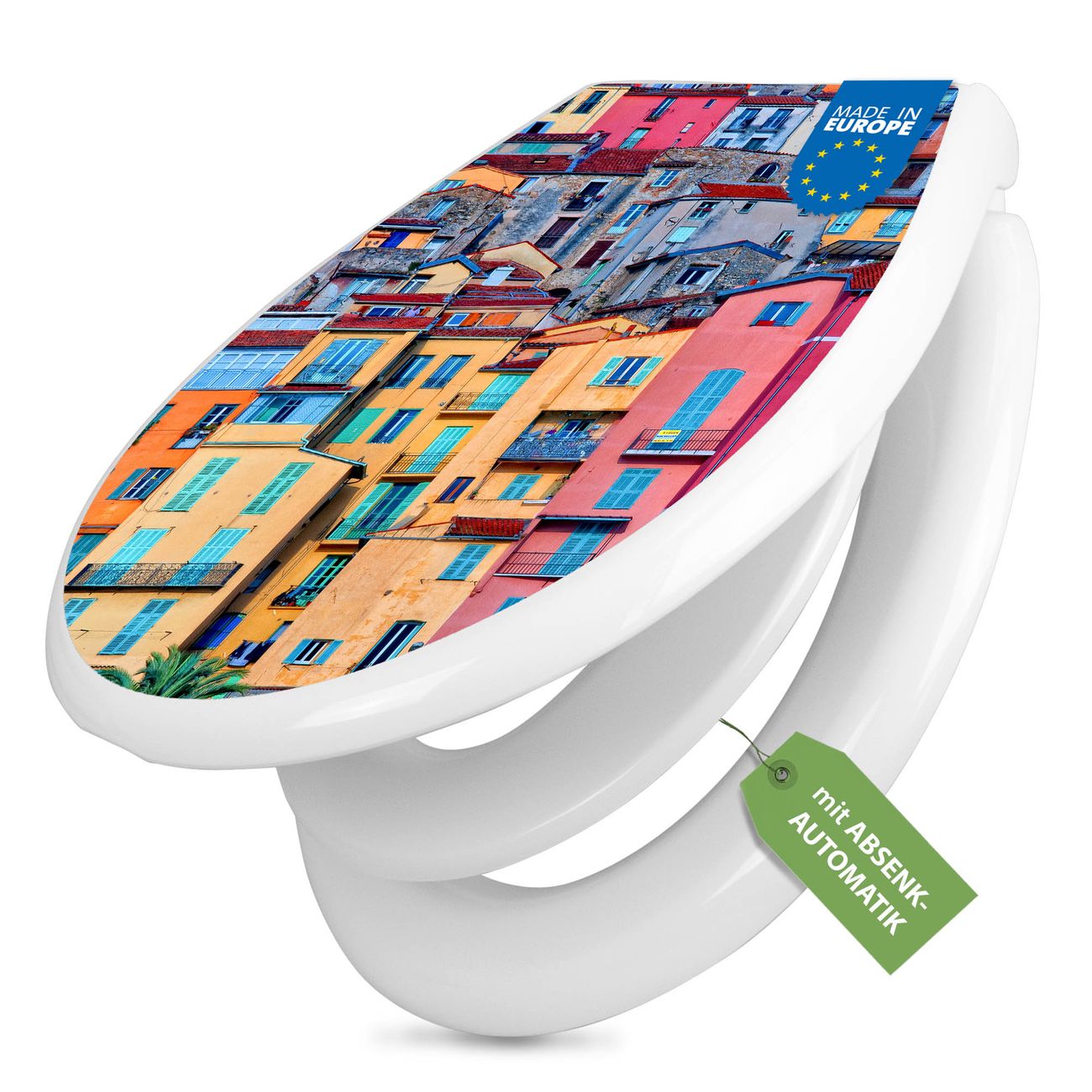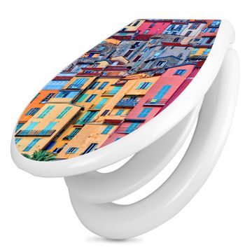 Toilettendeckel weiß mit Absenkautomatik Motiv Häuserberg