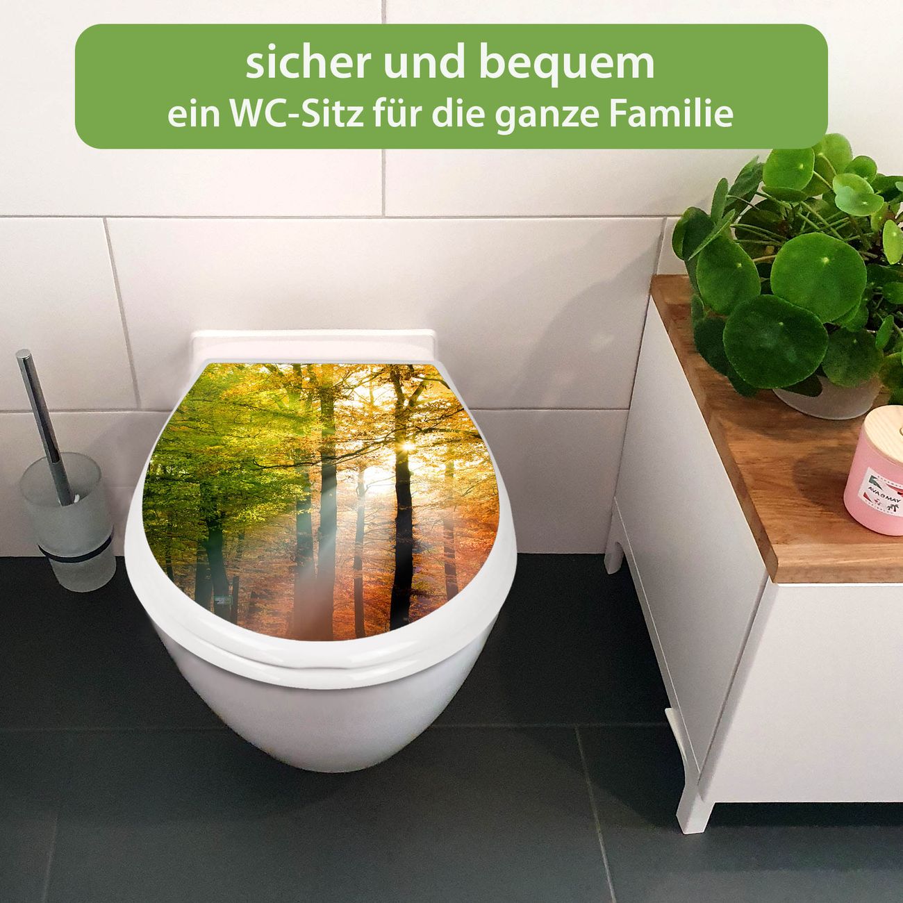 FUNKTION:Mit dem banjado Familien WC Sitz mit Absenkautomatik und dem Motiv Motiv Herbstwald verbinden Sie Design mit Funktionalität. Sie erhalten den Toilettendeckel in bewährt guter Qualität mit Montagematerial passend auf alle Euro-WC-Becken. Die Gesamtgröße beträgt 37,1cm x 44,9cm x 5cm, die Grundfarbe ist weiß.</p> DESIGN:Der Klodeckel in weiß mit Motiv Motiv Herbstwald hat eine ansprechende Optik, eine besondere Form und ist sehr stabil. Das Motiv besteht aus einer farbbrillianten Motivfolie, die durch ein Schutzlaminat zusätzlich vor Kratzern schützt. Der integrierte Kindersitz fügt sich harmonisch ein. DETAILS:Der Toilettensitz mit Soft Close besteht aus hochwertigem Polypropylen, ist geruchlos, ungiftig und kann mit handelsüblicher Seife gereinigt werden. Die Montage kann von von oben oder von unten erfolgen und ist kinderleicht. NUTZEN:Mit Hilfe der detaillierten Aufbauanleitung ermöglichen wir eine schnelle und unkomplizierte Montage. Die banjado Klobrille ist universell geeignet für alle Euro-WC-Schüsseln. Der Kindersitz kann unkompliziert entfernt werden. BANJADO:Ihr WC-Deckel wird in Sachsen in einer kleinen Manufaktur von Hand veredelt. Die Motivfolie ist lösungsmittelfrei und schutzlaminiert für einen langen Halt. Wir wünschen viel Freude bei der Auswahl eines schönen Motivs.