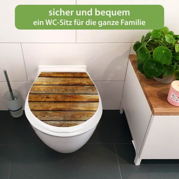 FUNKTION:Mit dem banjado Familien WC Sitz mit Absenkautomatik und dem Motiv Motiv Holzbretter verbinden Sie Design mit Funktionalität. Sie erhalten den Toilettendeckel in bewährt guter Qualität mit Montagematerial passend auf alle Euro-WC-Becken. Die Gesamtgröße beträgt 37,1cm x 44,9cm x 5cm, die Grundfarbe ist weiß.</p> DESIGN:Der Klodeckel in weiß mit Motiv Motiv Holzbretter hat eine ansprechende Optik, eine besondere Form und ist sehr stabil. Das Motiv besteht aus einer farbbrillianten Motivfolie, die durch ein Schutzlaminat zusätzlich vor Kratzern schützt. Der integrierte Kindersitz fügt sich harmonisch ein. DETAILS:Der Toilettensitz mit Soft Close besteht aus hochwertigem Polypropylen, ist geruchlos, ungiftig und kann mit handelsüblicher Seife gereinigt werden. Die Montage kann von von oben oder von unten erfolgen und ist kinderleicht. NUTZEN:Mit Hilfe der detaillierten Aufbauanleitung ermöglichen wir eine schnelle und unkomplizierte Montage. Die banjado Klobrille ist universell geeignet für alle Euro-WC-Schüsseln. Der Kindersitz kann unkompliziert entfernt werden. BANJADO:Ihr WC-Deckel wird in Sachsen in einer kleinen Manufaktur von Hand veredelt. Die Motivfolie ist lösungsmittelfrei und schutzlaminiert für einen langen Halt. Wir wünschen viel Freude bei der Auswahl eines schönen Motivs.