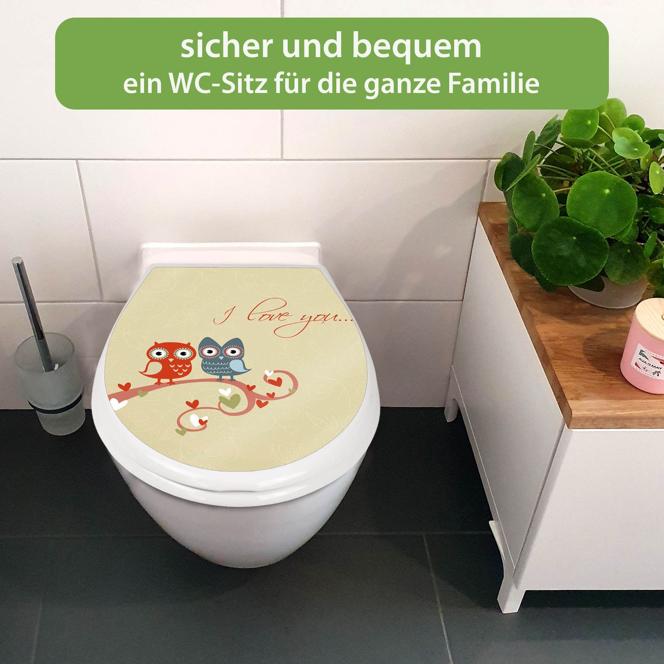 FUNKTION:Mit dem banjado Familien WC Sitz mit Absenkautomatik und dem Motiv Motiv I Love You verbinden Sie Design mit Funktionalität. Sie erhalten den Toilettendeckel in bewährt guter Qualität mit Montagematerial passend auf alle Euro-WC-Becken. Die Gesamtgröße beträgt 37,1cm x 44,9cm x 5cm, die Grundfarbe ist weiß.</p> DESIGN:Der Klodeckel in weiß mit Motiv Motiv I Love You hat eine ansprechende Optik, eine besondere Form und ist sehr stabil. Das Motiv besteht aus einer farbbrillianten Motivfolie, die durch ein Schutzlaminat zusätzlich vor Kratzern schützt. Der integrierte Kindersitz fügt sich harmonisch ein. DETAILS:Der Toilettensitz mit Soft Close besteht aus hochwertigem Polypropylen, ist geruchlos, ungiftig und kann mit handelsüblicher Seife gereinigt werden. Die Montage kann von von oben oder von unten erfolgen und ist kinderleicht. NUTZEN:Mit Hilfe der detaillierten Aufbauanleitung ermöglichen wir eine schnelle und unkomplizierte Montage. Die banjado Klobrille ist universell geeignet für alle Euro-WC-Schüsseln. Der Kindersitz kann unkompliziert entfernt werden. BANJADO:Ihr WC-Deckel wird in Sachsen in einer kleinen Manufaktur von Hand veredelt. Die Motivfolie ist lösungsmittelfrei und schutzlaminiert für einen langen Halt. Wir wünschen viel Freude bei der Auswahl eines schönen Motivs.