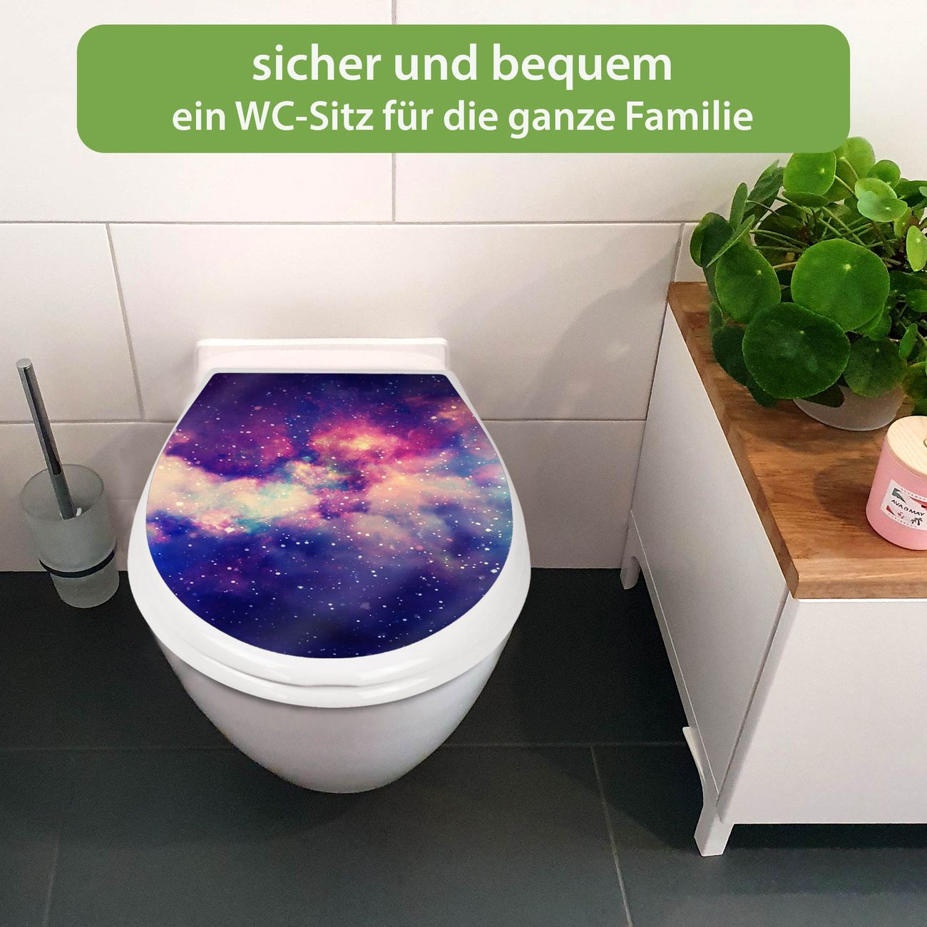 FUNKTION:Mit dem banjado Familien WC Sitz mit Absenkautomatik und dem Motiv Motiv Im Weltall 1 verbinden Sie Design mit Funktionalität. Sie erhalten den Toilettendeckel in bewährt guter Qualität mit Montagematerial passend auf alle Euro-WC-Becken. Die Gesamtgröße beträgt 37,1cm x 44,9cm x 5cm, die Grundfarbe ist weiß.</p> DESIGN:Der Klodeckel in weiß mit Motiv Motiv Im Weltall 1 hat eine ansprechende Optik, eine besondere Form und ist sehr stabil. Das Motiv besteht aus einer farbbrillianten Motivfolie, die durch ein Schutzlaminat zusätzlich vor Kratzern schützt. Der integrierte Kindersitz fügt sich harmonisch ein. DETAILS:Der Toilettensitz mit Soft Close besteht aus hochwertigem Polypropylen, ist geruchlos, ungiftig und kann mit handelsüblicher Seife gereinigt werden. Die Montage kann von von oben oder von unten erfolgen und ist kinderleicht. NUTZEN:Mit Hilfe der detaillierten Aufbauanleitung ermöglichen wir eine schnelle und unkomplizierte Montage. Die banjado Klobrille ist universell geeignet für alle Euro-WC-Schüsseln. Der Kindersitz kann unkompliziert entfernt werden. BANJADO:Ihr WC-Deckel wird in Sachsen in einer kleinen Manufaktur von Hand veredelt. Die Motivfolie ist lösungsmittelfrei und schutzlaminiert für einen langen Halt. Wir wünschen viel Freude bei der Auswahl eines schönen Motivs.