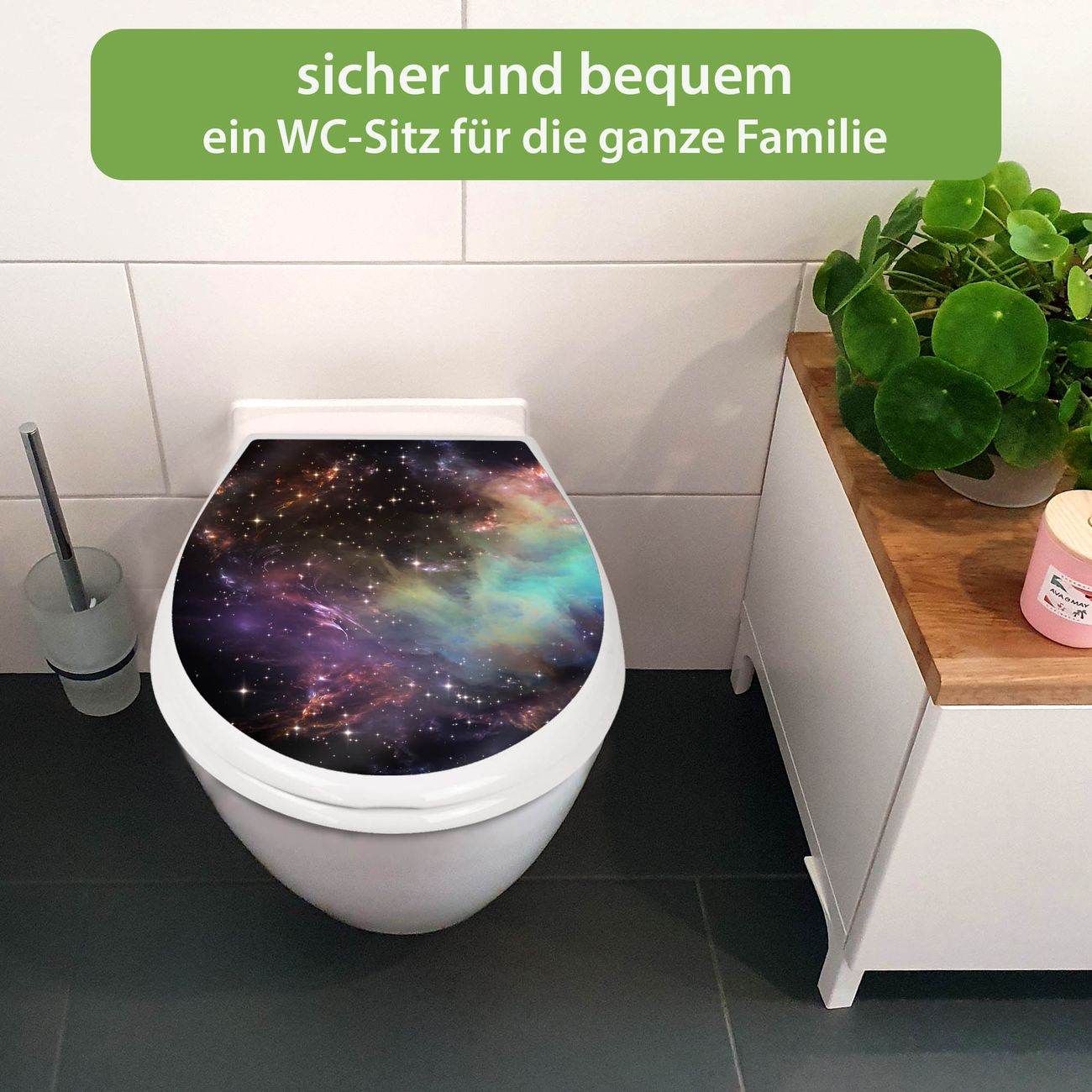 FUNKTION:Mit dem banjado Familien WC Sitz mit Absenkautomatik und dem Motiv Motiv Im Weltall 2 verbinden Sie Design mit Funktionalität. Sie erhalten den Toilettendeckel in bewährt guter Qualität mit Montagematerial passend auf alle Euro-WC-Becken. Die Gesamtgröße beträgt 37,1cm x 44,9cm x 5cm, die Grundfarbe ist weiß.</p> DESIGN:Der Klodeckel in weiß mit Motiv Motiv Im Weltall 2 hat eine ansprechende Optik, eine besondere Form und ist sehr stabil. Das Motiv besteht aus einer farbbrillianten Motivfolie, die durch ein Schutzlaminat zusätzlich vor Kratzern schützt. Der integrierte Kindersitz fügt sich harmonisch ein. DETAILS:Der Toilettensitz mit Soft Close besteht aus hochwertigem Polypropylen, ist geruchlos, ungiftig und kann mit handelsüblicher Seife gereinigt werden. Die Montage kann von von oben oder von unten erfolgen und ist kinderleicht. NUTZEN:Mit Hilfe der detaillierten Aufbauanleitung ermöglichen wir eine schnelle und unkomplizierte Montage. Die banjado Klobrille ist universell geeignet für alle Euro-WC-Schüsseln. Der Kindersitz kann unkompliziert entfernt werden. BANJADO:Ihr WC-Deckel wird in Sachsen in einer kleinen Manufaktur von Hand veredelt. Die Motivfolie ist lösungsmittelfrei und schutzlaminiert für einen langen Halt. Wir wünschen viel Freude bei der Auswahl eines schönen Motivs.