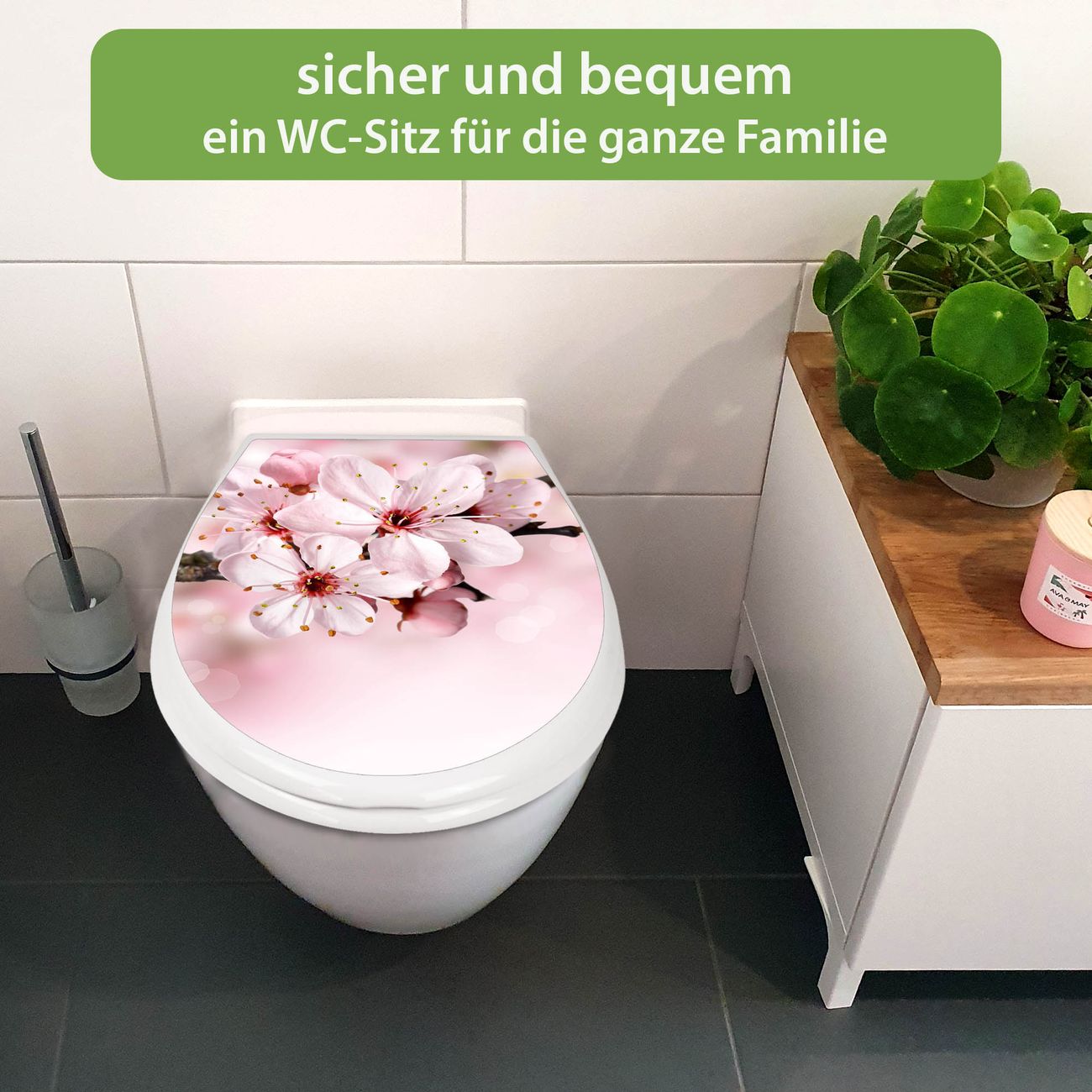 FUNKTION:Mit dem banjado Familien WC Sitz mit Absenkautomatik und dem Motiv Motiv Japanische Kirsche verbinden Sie Design mit Funktionalität. Sie erhalten den Toilettendeckel in bewährt guter Qualität mit Montagematerial passend auf alle Euro-WC-Becken. Die Gesamtgröße beträgt 37,1cm x 44,9cm x 5cm, die Grundfarbe ist weiß.</p> DESIGN:Der Klodeckel in weiß mit Motiv Motiv Japanische Kirsche hat eine ansprechende Optik, eine besondere Form und ist sehr stabil. Das Motiv besteht aus einer farbbrillianten Motivfolie, die durch ein Schutzlaminat zusätzlich vor Kratzern schützt. Der integrierte Kindersitz fügt sich harmonisch ein. DETAILS:Der Toilettensitz mit Soft Close besteht aus hochwertigem Polypropylen, ist geruchlos, ungiftig und kann mit handelsüblicher Seife gereinigt werden. Die Montage kann von von oben oder von unten erfolgen und ist kinderleicht. NUTZEN:Mit Hilfe der detaillierten Aufbauanleitung ermöglichen wir eine schnelle und unkomplizierte Montage. Die banjado Klobrille ist universell geeignet für alle Euro-WC-Schüsseln. Der Kindersitz kann unkompliziert entfernt werden. BANJADO:Ihr WC-Deckel wird in Sachsen in einer kleinen Manufaktur von Hand veredelt. Die Motivfolie ist lösungsmittelfrei und schutzlaminiert für einen langen Halt. Wir wünschen viel Freude bei der Auswahl eines schönen Motivs.