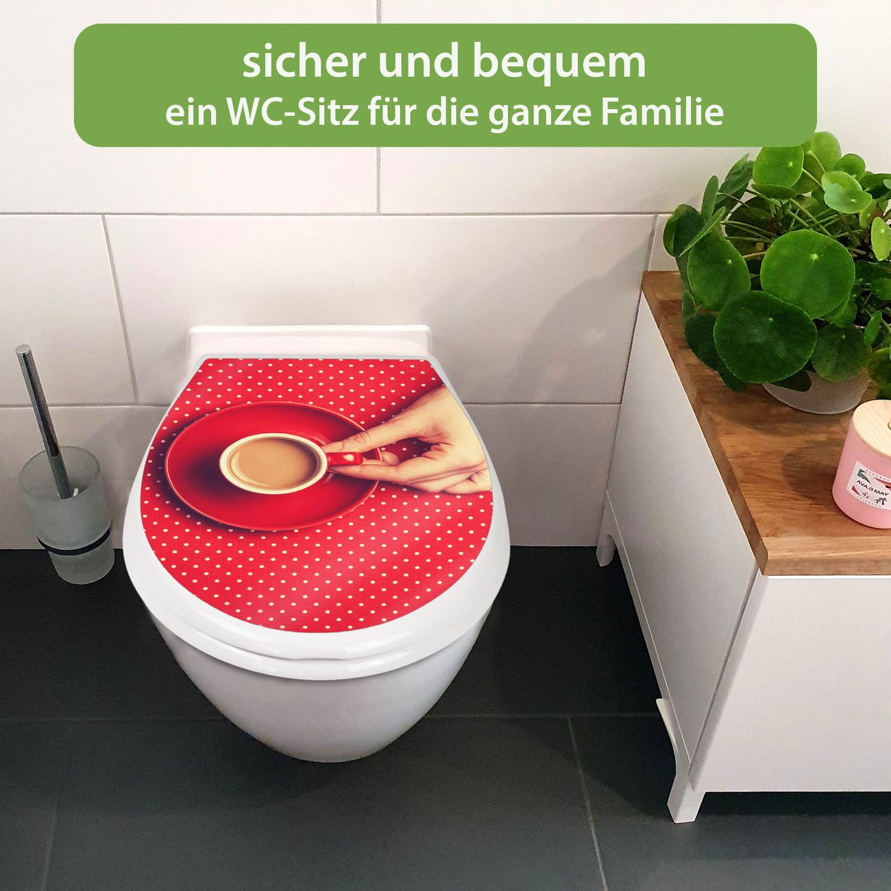 FUNKTION:Mit dem banjado Familien WC Sitz mit Absenkautomatik und dem Motiv Motiv Kaffee Rot Weiss verbinden Sie Design mit Funktionalität. Sie erhalten den Toilettendeckel in bewährt guter Qualität mit Montagematerial passend auf alle Euro-WC-Becken. Die Gesamtgröße beträgt 37,1cm x 44,9cm x 5cm, die Grundfarbe ist weiß.</p> DESIGN:Der Klodeckel in weiß mit Motiv Motiv Kaffee Rot Weiss hat eine ansprechende Optik, eine besondere Form und ist sehr stabil. Das Motiv besteht aus einer farbbrillianten Motivfolie, die durch ein Schutzlaminat zusätzlich vor Kratzern schützt. Der integrierte Kindersitz fügt sich harmonisch ein. DETAILS:Der Toilettensitz mit Soft Close besteht aus hochwertigem Polypropylen, ist geruchlos, ungiftig und kann mit handelsüblicher Seife gereinigt werden. Die Montage kann von von oben oder von unten erfolgen und ist kinderleicht. NUTZEN:Mit Hilfe der detaillierten Aufbauanleitung ermöglichen wir eine schnelle und unkomplizierte Montage. Die banjado Klobrille ist universell geeignet für alle Euro-WC-Schüsseln. Der Kindersitz kann unkompliziert entfernt werden. BANJADO:Ihr WC-Deckel wird in Sachsen in einer kleinen Manufaktur von Hand veredelt. Die Motivfolie ist lösungsmittelfrei und schutzlaminiert für einen langen Halt. Wir wünschen viel Freude bei der Auswahl eines schönen Motivs.