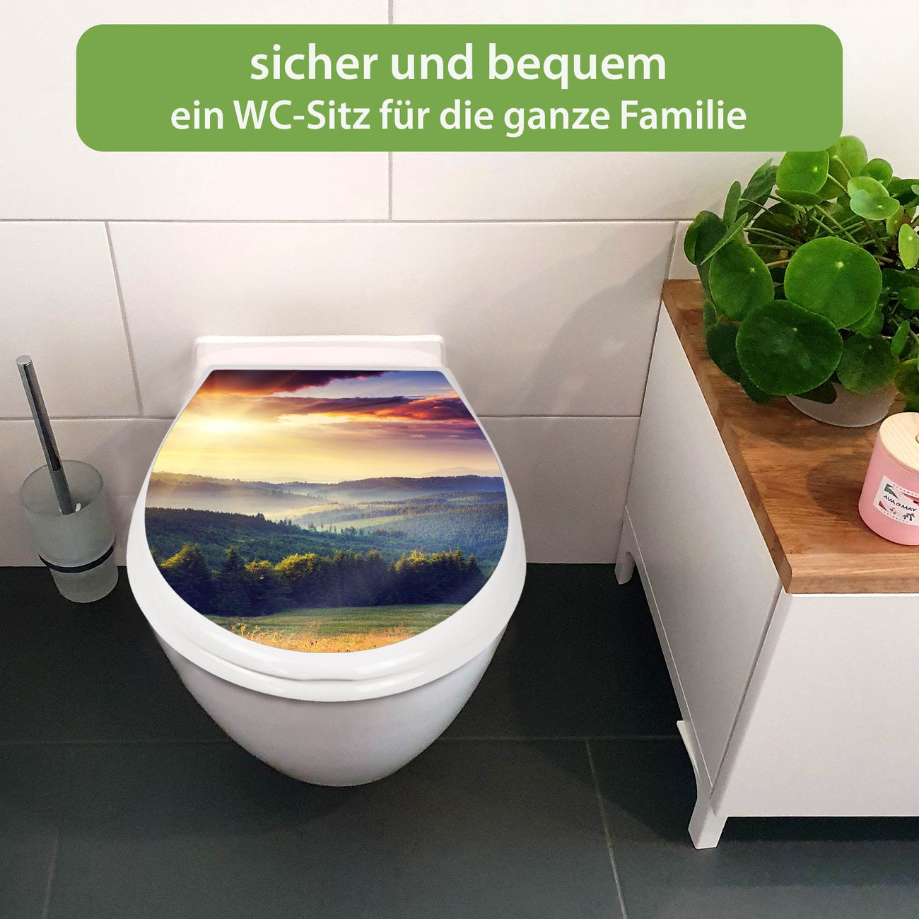FUNKTION:Mit dem banjado Familien WC Sitz mit Absenkautomatik und dem Motiv Motiv Karpaten Sonnenuntergang verbinden Sie Design mit Funktionalität. Sie erhalten den Toilettendeckel in bewährt guter Qualität mit Montagematerial passend auf alle Euro-WC-Becken. Die Gesamtgröße beträgt 37,1cm x 44,9cm x 5cm, die Grundfarbe ist weiß.</p> DESIGN:Der Klodeckel in weiß mit Motiv Motiv Karpaten Sonnenuntergang hat eine ansprechende Optik, eine besondere Form und ist sehr stabil. Das Motiv besteht aus einer farbbrillianten Motivfolie, die durch ein Schutzlaminat zusätzlich vor Kratzern schützt. Der integrierte Kindersitz fügt sich harmonisch ein. DETAILS:Der Toilettensitz mit Soft Close besteht aus hochwertigem Polypropylen, ist geruchlos, ungiftig und kann mit handelsüblicher Seife gereinigt werden. Die Montage kann von von oben oder von unten erfolgen und ist kinderleicht. NUTZEN:Mit Hilfe der detaillierten Aufbauanleitung ermöglichen wir eine schnelle und unkomplizierte Montage. Die banjado Klobrille ist universell geeignet für alle Euro-WC-Schüsseln. Der Kindersitz kann unkompliziert entfernt werden. BANJADO:Ihr WC-Deckel wird in Sachsen in einer kleinen Manufaktur von Hand veredelt. Die Motivfolie ist lösungsmittelfrei und schutzlaminiert für einen langen Halt. Wir wünschen viel Freude bei der Auswahl eines schönen Motivs.