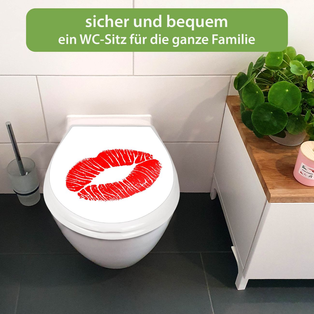 FUNKTION:Mit dem banjado Familien WC Sitz mit Absenkautomatik und dem Motiv Motiv Kussmund verbinden Sie Design mit Funktionalität. Sie erhalten den Toilettendeckel in bewährt guter Qualität mit Montagematerial passend auf alle Euro-WC-Becken. Die Gesamtgröße beträgt 37,1cm x 44,9cm x 5cm, die Grundfarbe ist weiß.</p> DESIGN:Der Klodeckel in weiß mit Motiv Motiv Kussmund hat eine ansprechende Optik, eine besondere Form und ist sehr stabil. Das Motiv besteht aus einer farbbrillianten Motivfolie, die durch ein Schutzlaminat zusätzlich vor Kratzern schützt. Der integrierte Kindersitz fügt sich harmonisch ein. DETAILS:Der Toilettensitz mit Soft Close besteht aus hochwertigem Polypropylen, ist geruchlos, ungiftig und kann mit handelsüblicher Seife gereinigt werden. Die Montage kann von von oben oder von unten erfolgen und ist kinderleicht. NUTZEN:Mit Hilfe der detaillierten Aufbauanleitung ermöglichen wir eine schnelle und unkomplizierte Montage. Die banjado Klobrille ist universell geeignet für alle Euro-WC-Schüsseln. Der Kindersitz kann unkompliziert entfernt werden. BANJADO:Ihr WC-Deckel wird in Sachsen in einer kleinen Manufaktur von Hand veredelt. Die Motivfolie ist lösungsmittelfrei und schutzlaminiert für einen langen Halt. Wir wünschen viel Freude bei der Auswahl eines schönen Motivs.