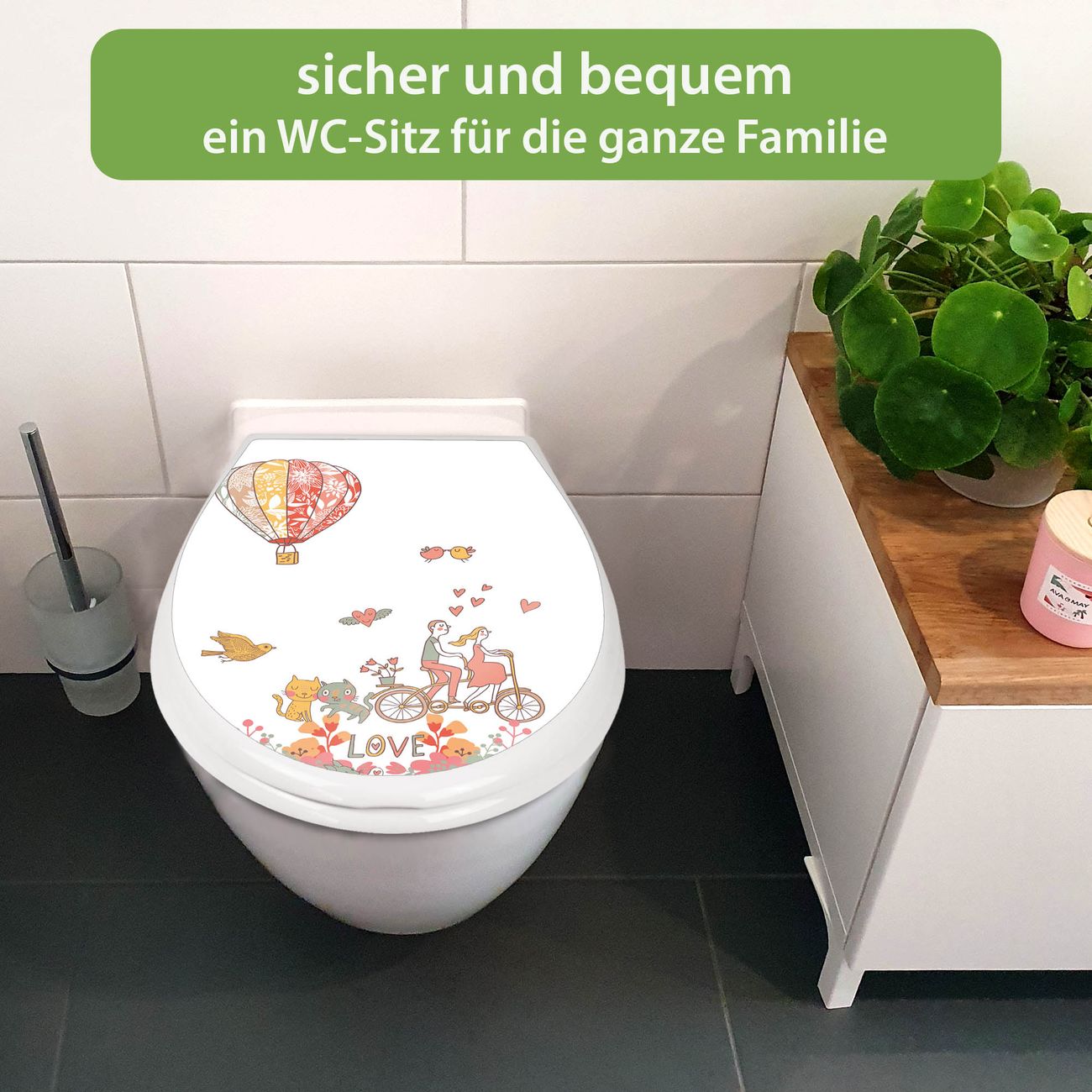 FUNKTION:Mit dem banjado Familien WC Sitz mit Absenkautomatik und dem Motiv Motiv Love verbinden Sie Design mit Funktionalität. Sie erhalten den Toilettendeckel in bewährt guter Qualität mit Montagematerial passend auf alle Euro-WC-Becken. Die Gesamtgröße beträgt 37,1cm x 44,9cm x 5cm, die Grundfarbe ist weiß.</p> DESIGN:Der Klodeckel in weiß mit Motiv Motiv Love hat eine ansprechende Optik, eine besondere Form und ist sehr stabil. Das Motiv besteht aus einer farbbrillianten Motivfolie, die durch ein Schutzlaminat zusätzlich vor Kratzern schützt. Der integrierte Kindersitz fügt sich harmonisch ein. DETAILS:Der Toilettensitz mit Soft Close besteht aus hochwertigem Polypropylen, ist geruchlos, ungiftig und kann mit handelsüblicher Seife gereinigt werden. Die Montage kann von von oben oder von unten erfolgen und ist kinderleicht. NUTZEN:Mit Hilfe der detaillierten Aufbauanleitung ermöglichen wir eine schnelle und unkomplizierte Montage. Die banjado Klobrille ist universell geeignet für alle Euro-WC-Schüsseln. Der Kindersitz kann unkompliziert entfernt werden. BANJADO:Ihr WC-Deckel wird in Sachsen in einer kleinen Manufaktur von Hand veredelt. Die Motivfolie ist lösungsmittelfrei und schutzlaminiert für einen langen Halt. Wir wünschen viel Freude bei der Auswahl eines schönen Motivs.