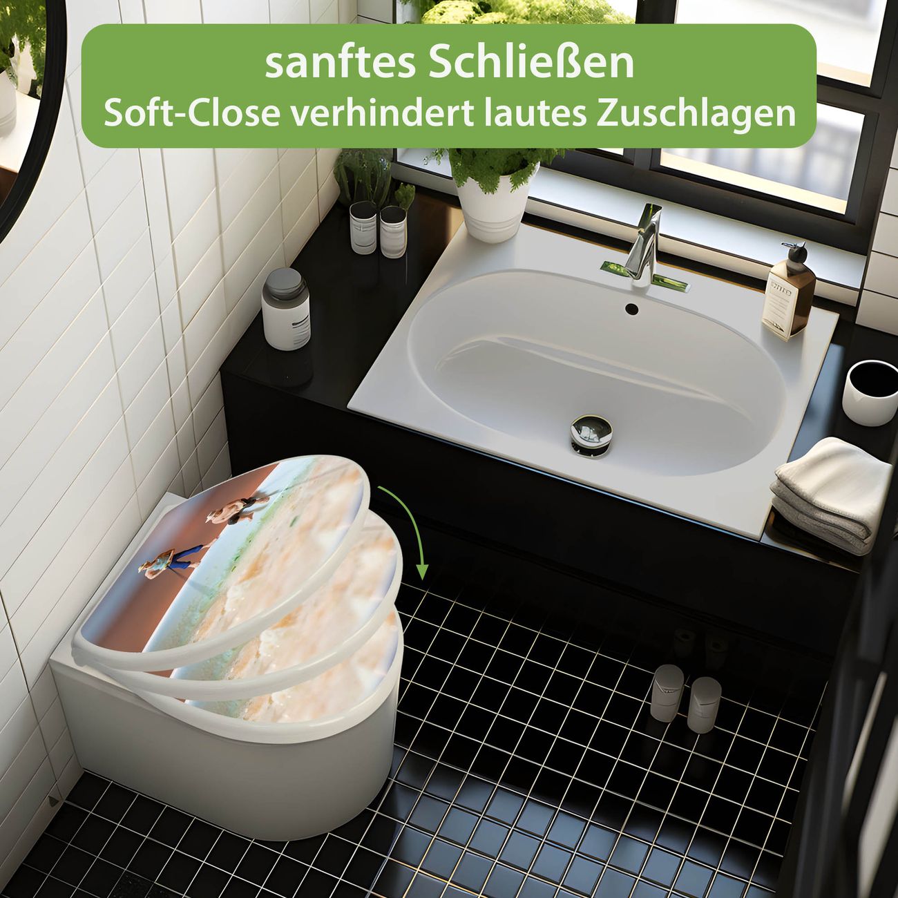 FUNKTION: Mit dem banjado Toilettendeckel mit Absenkautomatik verbinden Sie Design mit Funktionalität. Sie erhalten den WC Sitz in bewährt guter Qualität mit Edelstahl Scharnieren und Montagematerial. DESIGN: Der Klodeckel hat eine ansprechende Optik, eine besondere Form und ist sehr stabil. Das Motiv besteht aus einer farbbrillianten Motivfolie, die durch ein Schutzlaminat zusätzlich vor Kratzern schützt. DETAILS: Der Toilettensitz besteht aus Duroplast, die Scharniere sind aus hochwertigem Edelstahl, Materialien die Ihnen eine leichte und hygienische Reinigung ermöglichen. Die Gesamtgröße beträgt 37,3cm x 45cm x 5cm, die Grundfarbe ist weiß. NUTZEN: Mit Hilfe der detaillierten Aufbauanleitung ermöglichen wir eine schnelle und unkomplizierte Montage. Die banjado Klobrille ist universell geeignet für alle gängigen WC Schüsseln. Der Lochabstand zur Befestigung kann variable eingestellt werden. BANJADO: Ihr WC-Deckel wird in Sachsen in einer kleinen Manufaktur von Hand veredelt. Die Motivfolie ist lösungsmittelfrei und schutzlaminiert, für einen langen Halt. Wir wünschen viel Freude bei der Auswahl eines schönen Motivs.