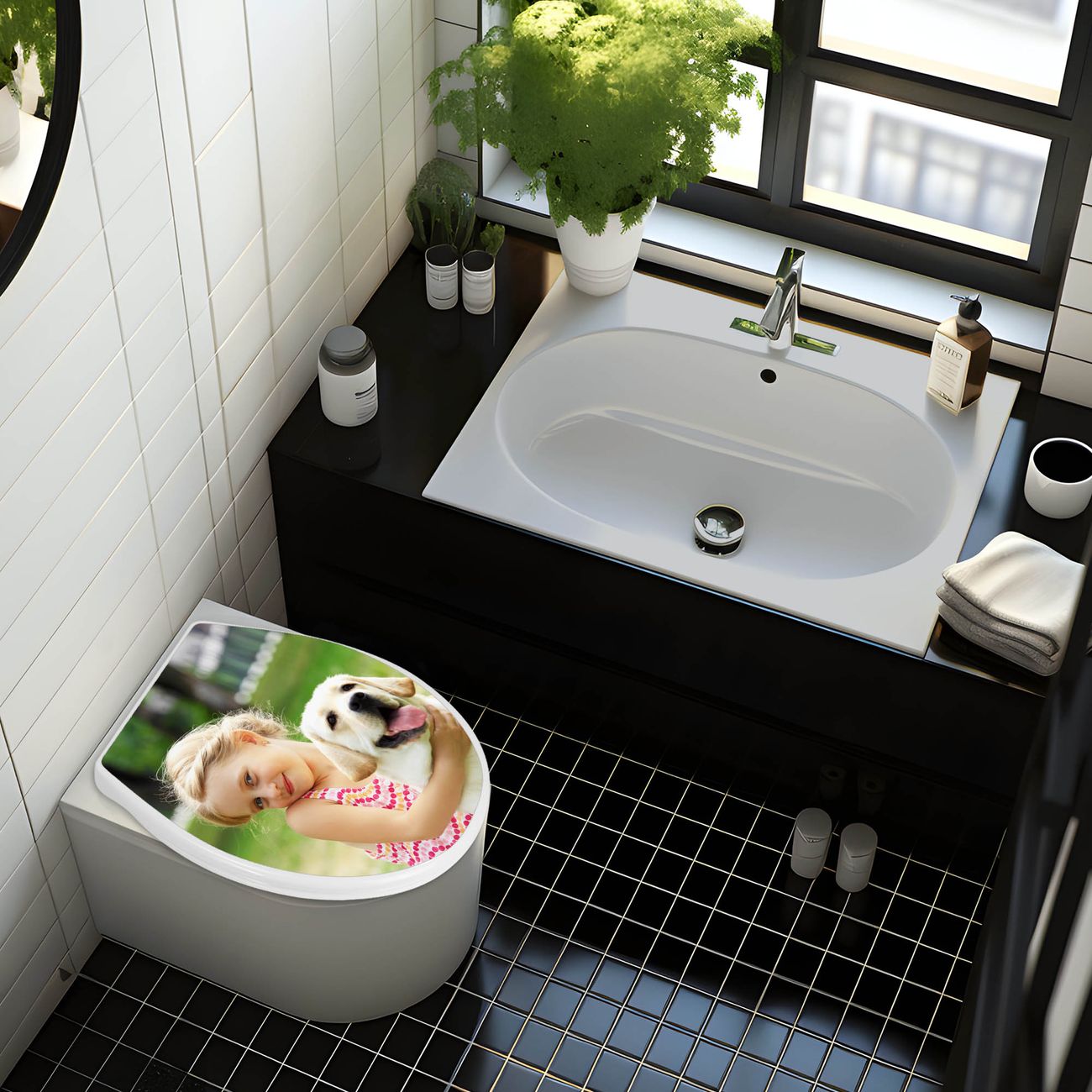 FUNKTION:Mit dem banjado Familien WC Sitz mit Absenkautomatik und dem Motiv mit Ihrem eigenen Motiv verbinden Sie Design mit Funktionalität. Sie erhalten den Toilettendeckel in bewährt guter Qualität mit Montagematerial passend auf alle Euro-WC-Becken. Die Gesamtgröße beträgt 37cm x 44,5cm x 5cm, die Grundfarbe ist weiß.</p> DESIGN:Der Klodeckel in weiß mit Motiv mit Ihrem eigenen Motiv hat eine ansprechende Optik, eine besondere Form und ist sehr stabil. Das Motiv besteht aus einer farbbrillianten Motivfolie, die durch ein Schutzlaminat zusätzlich vor Kratzern schützt. Der integrierte Kindersitz fügt sich harmonisch ein. DETAILS:Der Toilettensitz mit Soft Close besteht aus hochwertigem Polypropylen, ist geruchlos, ungiftig und kann mit handelsüblicher Seife gereinigt werden. Die Montage kann von von oben oder von unten erfolgen und ist kinderleicht. NUTZEN:Mit Hilfe der detaillierten Aufbauanleitung ermöglichen wir eine schnelle und unkomplizierte Montage. Die banjado Klobrille ist universell geeignet für alle Euro-WC-Schüsseln. Der Kindersitz kann unkompliziert entfernt werden. BANJADO:Ihr WC-Deckel wird in Sachsen in einer kleinen Manufaktur von Hand veredelt. Die Motivfolie ist lösungsmittelfrei und schutzlaminiert für einen langen Halt. Wir wünschen viel Freude bei der Auswahl eines schönen Motivs.