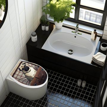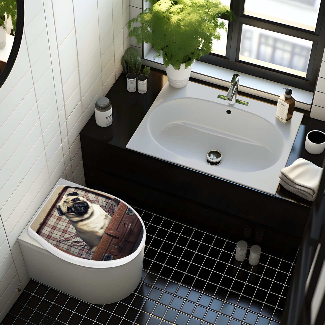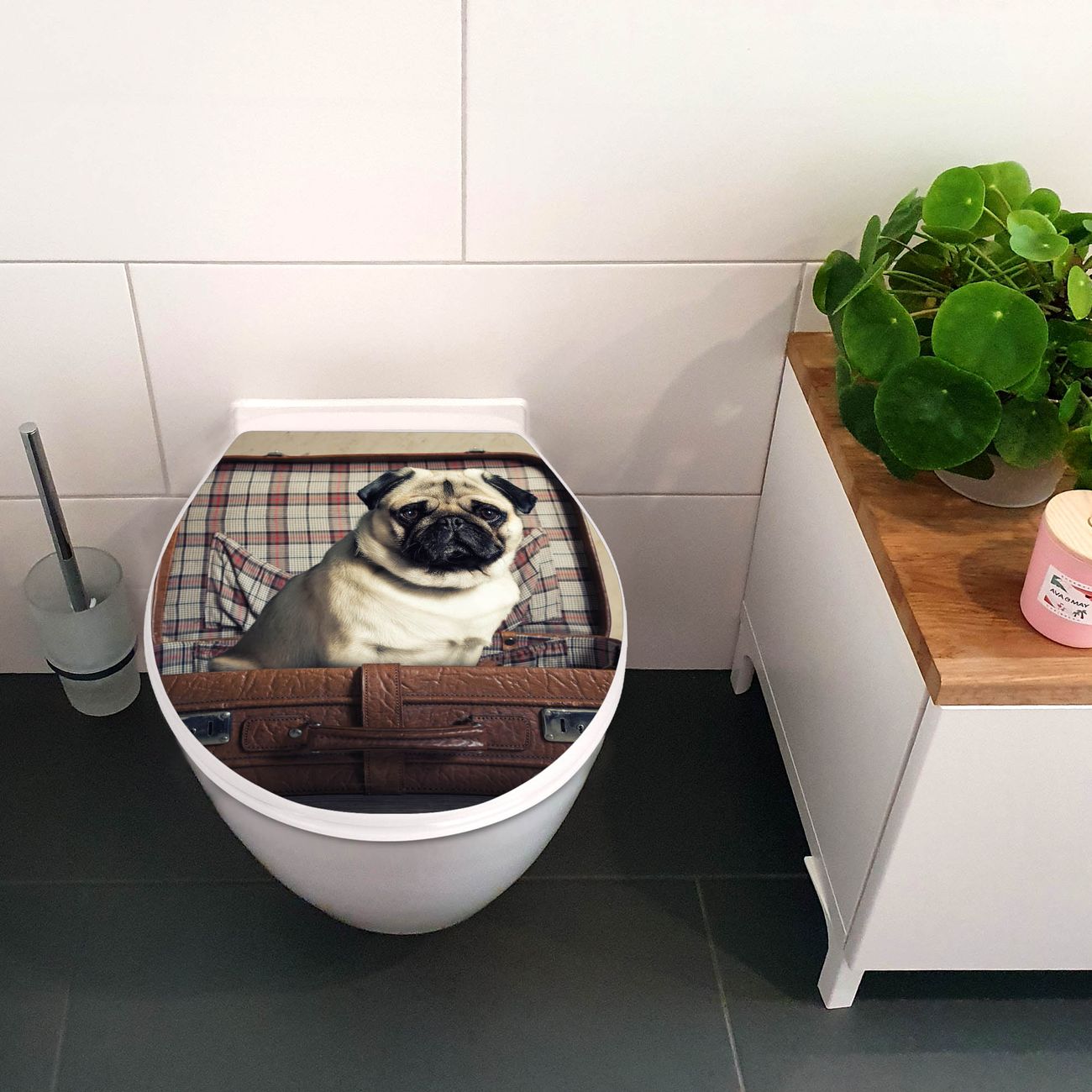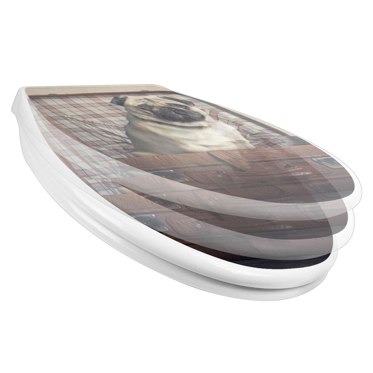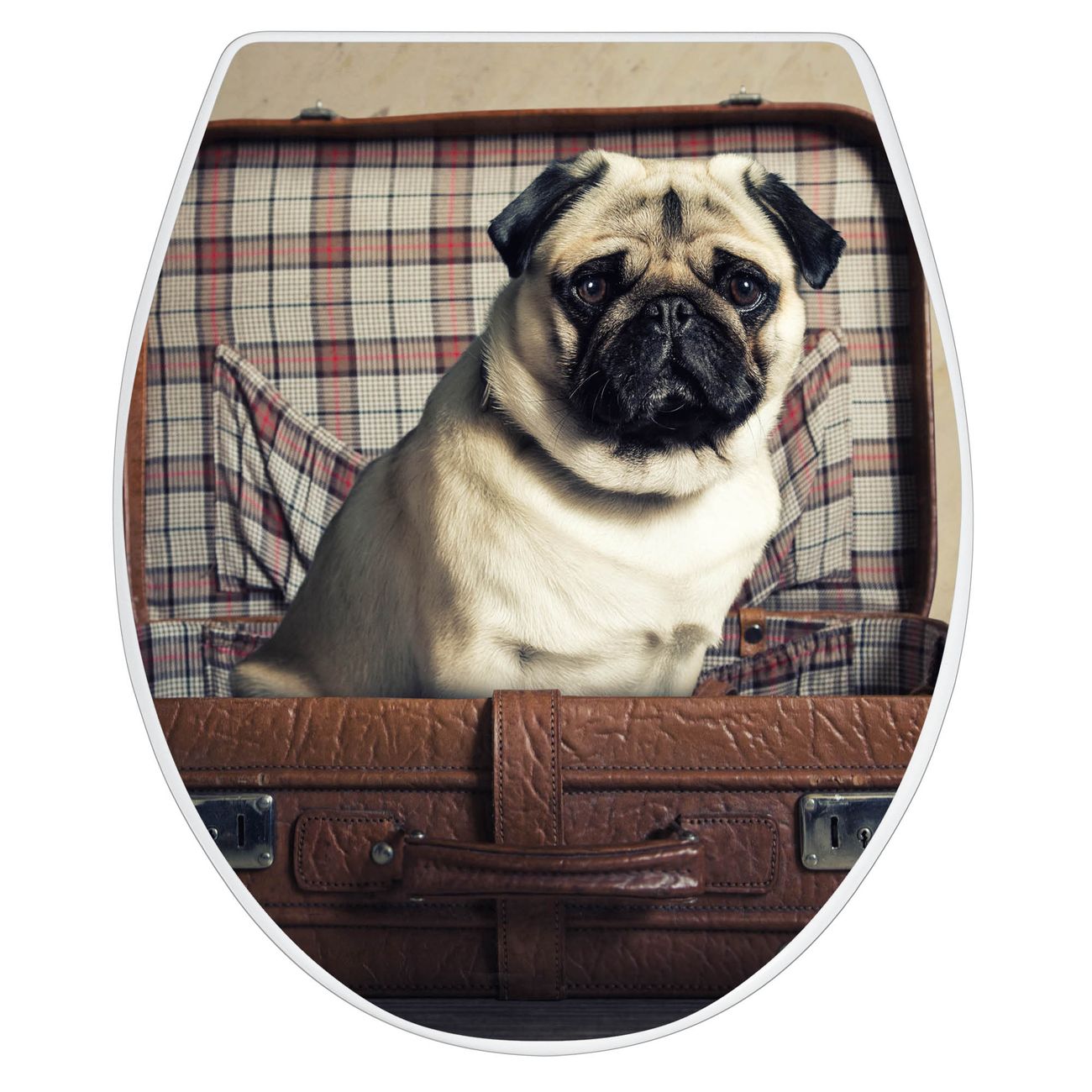 Toilettendeckel weiß mit Absenkautomatik Motiv Mops im Koffer
