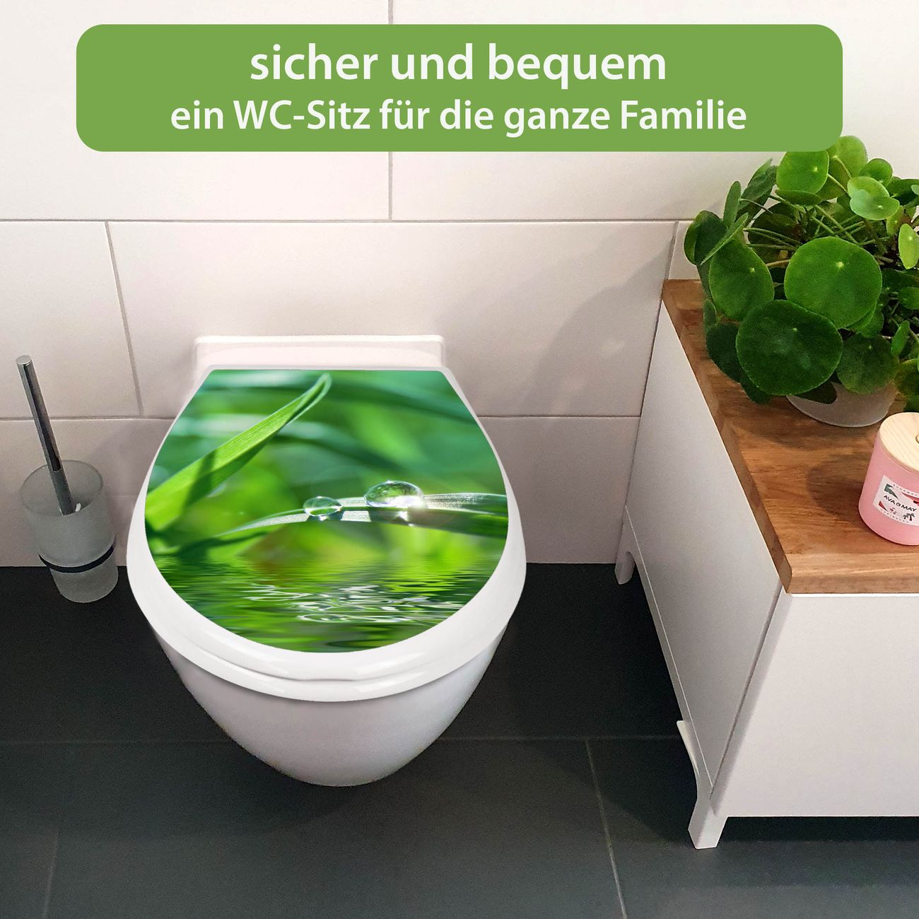 FUNKTION:Mit dem banjado Familien WC Sitz mit Absenkautomatik und dem Motiv Motiv Morgentau verbinden Sie Design mit Funktionalität. Sie erhalten den Toilettendeckel in bewährt guter Qualität mit Montagematerial passend auf alle Euro-WC-Becken. Die Gesamtgröße beträgt 37,1cm x 44,9cm x 5cm, die Grundfarbe ist weiß.</p> DESIGN:Der Klodeckel in weiß mit Motiv Motiv Morgentau hat eine ansprechende Optik, eine besondere Form und ist sehr stabil. Das Motiv besteht aus einer farbbrillianten Motivfolie, die durch ein Schutzlaminat zusätzlich vor Kratzern schützt. Der integrierte Kindersitz fügt sich harmonisch ein. DETAILS:Der Toilettensitz mit Soft Close besteht aus hochwertigem Polypropylen, ist geruchlos, ungiftig und kann mit handelsüblicher Seife gereinigt werden. Die Montage kann von von oben oder von unten erfolgen und ist kinderleicht. NUTZEN:Mit Hilfe der detaillierten Aufbauanleitung ermöglichen wir eine schnelle und unkomplizierte Montage. Die banjado Klobrille ist universell geeignet für alle Euro-WC-Schüsseln. Der Kindersitz kann unkompliziert entfernt werden. BANJADO:Ihr WC-Deckel wird in Sachsen in einer kleinen Manufaktur von Hand veredelt. Die Motivfolie ist lösungsmittelfrei und schutzlaminiert für einen langen Halt. Wir wünschen viel Freude bei der Auswahl eines schönen Motivs.