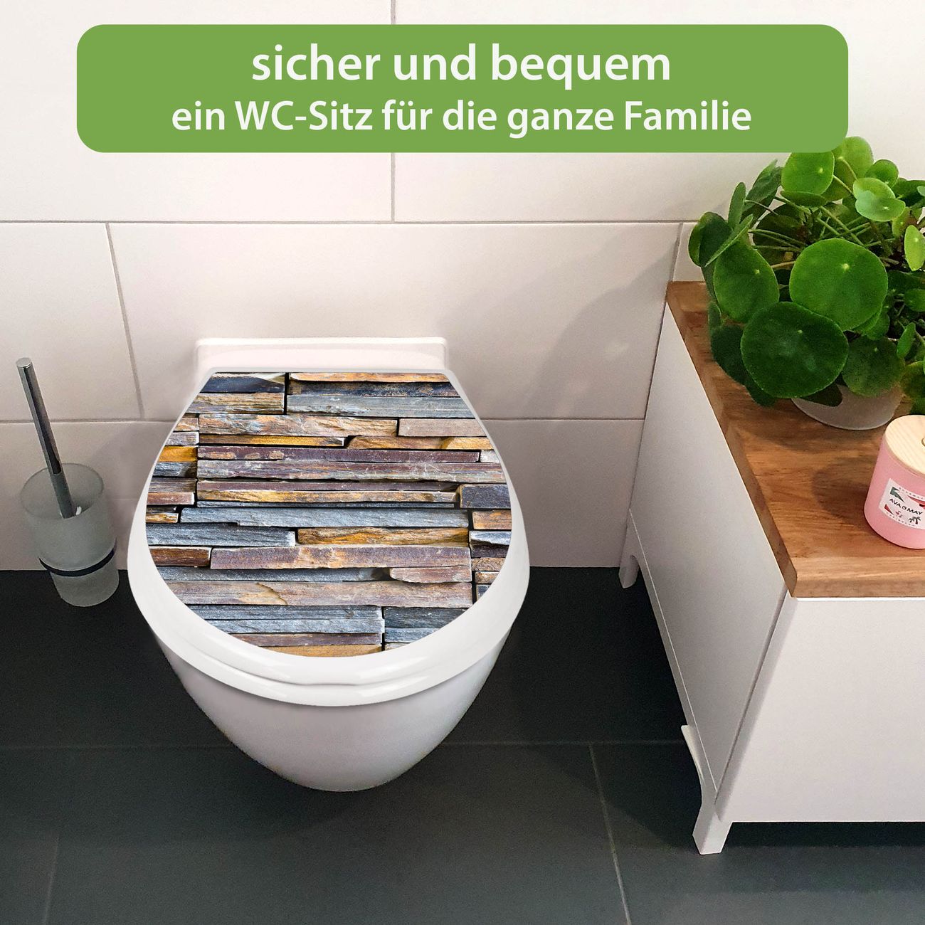 FUNKTION:Mit dem banjado Familien WC Sitz mit Absenkautomatik und dem Motiv Motiv Naturstein verbinden Sie Design mit Funktionalität. Sie erhalten den Toilettendeckel in bewährt guter Qualität mit Montagematerial passend auf alle Euro-WC-Becken. Die Gesamtgröße beträgt 37,1cm x 44,9cm x 5cm, die Grundfarbe ist weiß.</p> DESIGN:Der Klodeckel in weiß mit Motiv Motiv Naturstein hat eine ansprechende Optik, eine besondere Form und ist sehr stabil. Das Motiv besteht aus einer farbbrillianten Motivfolie, die durch ein Schutzlaminat zusätzlich vor Kratzern schützt. Der integrierte Kindersitz fügt sich harmonisch ein. DETAILS:Der Toilettensitz mit Soft Close besteht aus hochwertigem Polypropylen, ist geruchlos, ungiftig und kann mit handelsüblicher Seife gereinigt werden. Die Montage kann von von oben oder von unten erfolgen und ist kinderleicht. NUTZEN:Mit Hilfe der detaillierten Aufbauanleitung ermöglichen wir eine schnelle und unkomplizierte Montage. Die banjado Klobrille ist universell geeignet für alle Euro-WC-Schüsseln. Der Kindersitz kann unkompliziert entfernt werden. BANJADO:Ihr WC-Deckel wird in Sachsen in einer kleinen Manufaktur von Hand veredelt. Die Motivfolie ist lösungsmittelfrei und schutzlaminiert für einen langen Halt. Wir wünschen viel Freude bei der Auswahl eines schönen Motivs.