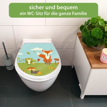 FUNKTION:Mit dem banjado Familien WC Sitz mit Absenkautomatik und dem Motiv Motiv Neulich Im Wald verbinden Sie Design mit Funktionalität. Sie erhalten den Toilettendeckel in bewährt guter Qualität mit Montagematerial passend auf alle Euro-WC-Becken. Die Gesamtgröße beträgt 37,1cm x 44,9cm x 5cm, die Grundfarbe ist weiß.</p> DESIGN:Der Klodeckel in weiß mit Motiv Motiv Neulich Im Wald hat eine ansprechende Optik, eine besondere Form und ist sehr stabil. Das Motiv besteht aus einer farbbrillianten Motivfolie, die durch ein Schutzlaminat zusätzlich vor Kratzern schützt. Der integrierte Kindersitz fügt sich harmonisch ein. DETAILS:Der Toilettensitz mit Soft Close besteht aus hochwertigem Polypropylen, ist geruchlos, ungiftig und kann mit handelsüblicher Seife gereinigt werden. Die Montage kann von von oben oder von unten erfolgen und ist kinderleicht. NUTZEN:Mit Hilfe der detaillierten Aufbauanleitung ermöglichen wir eine schnelle und unkomplizierte Montage. Die banjado Klobrille ist universell geeignet für alle Euro-WC-Schüsseln. Der Kindersitz kann unkompliziert entfernt werden. BANJADO:Ihr WC-Deckel wird in Sachsen in einer kleinen Manufaktur von Hand veredelt. Die Motivfolie ist lösungsmittelfrei und schutzlaminiert für einen langen Halt. Wir wünschen viel Freude bei der Auswahl eines schönen Motivs.