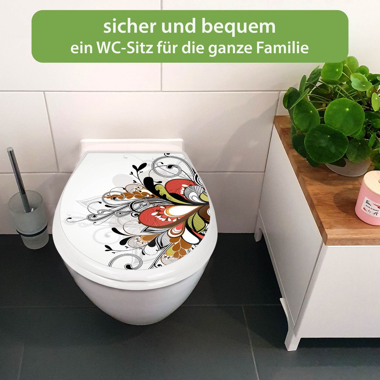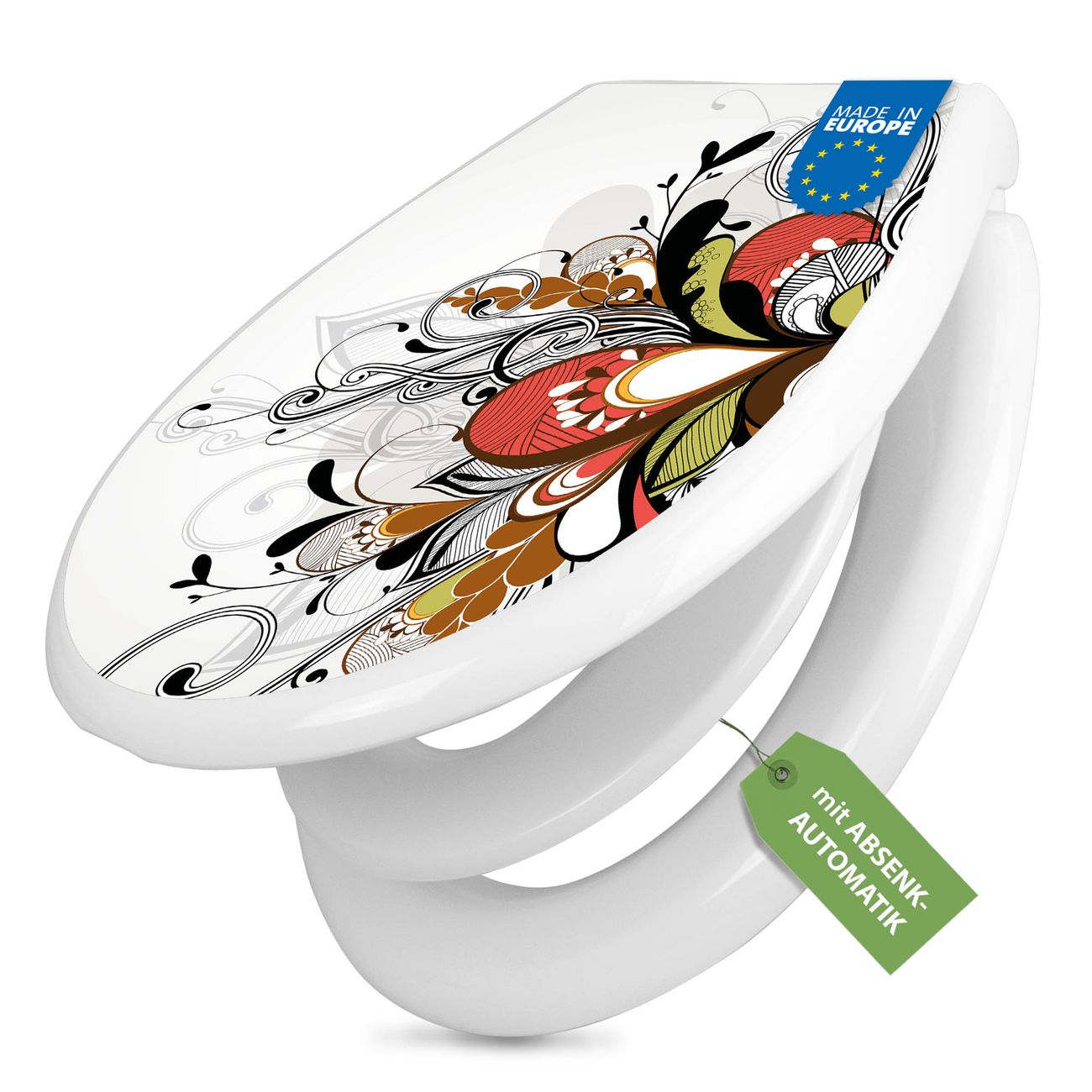 FUNKTION:Mit dem banjado Familien WC Sitz mit Absenkautomatik und dem Motiv Motiv Ornament 2 verbinden Sie Design mit Funktionalität. Sie erhalten den Toilettendeckel in bewährt guter Qualität mit Montagematerial passend auf alle Euro-WC-Becken. Die Gesamtgröße beträgt 37,1cm x 44,9cm x 5cm, die Grundfarbe ist weiß.</p> DESIGN:Der Klodeckel in weiß mit Motiv Motiv Ornament 2 hat eine ansprechende Optik, eine besondere Form und ist sehr stabil. Das Motiv besteht aus einer farbbrillianten Motivfolie, die durch ein Schutzlaminat zusätzlich vor Kratzern schützt. Der integrierte Kindersitz fügt sich harmonisch ein. DETAILS:Der Toilettensitz mit Soft Close besteht aus hochwertigem Polypropylen, ist geruchlos, ungiftig und kann mit handelsüblicher Seife gereinigt werden. Die Montage kann von von oben oder von unten erfolgen und ist kinderleicht. NUTZEN:Mit Hilfe der detaillierten Aufbauanleitung ermöglichen wir eine schnelle und unkomplizierte Montage. Die banjado Klobrille ist universell geeignet für alle Euro-WC-Schüsseln. Der Kindersitz kann unkompliziert entfernt werden. BANJADO:Ihr WC-Deckel wird in Sachsen in einer kleinen Manufaktur von Hand veredelt. Die Motivfolie ist lösungsmittelfrei und schutzlaminiert für einen langen Halt. Wir wünschen viel Freude bei der Auswahl eines schönen Motivs.