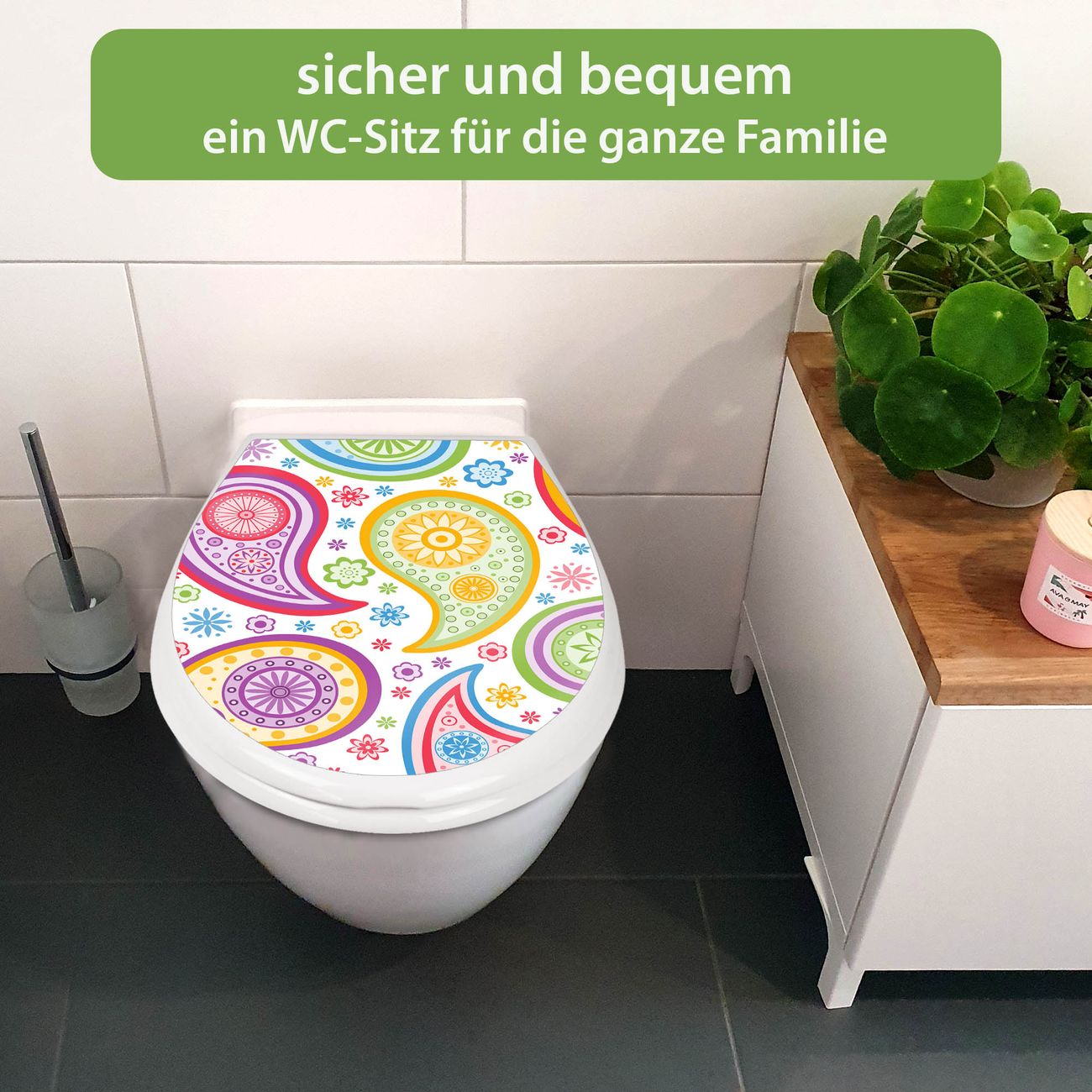 FUNKTION:Mit dem banjado Familien WC Sitz mit Absenkautomatik und dem Motiv Motiv Paisley bunt verbinden Sie Design mit Funktionalität. Sie erhalten den Toilettendeckel in bewährt guter Qualität mit Montagematerial passend auf alle Euro-WC-Becken. Die Gesamtgröße beträgt 37,1cm x 44,9cm x 5cm, die Grundfarbe ist weiß.</p> DESIGN:Der Klodeckel in weiß mit Motiv Motiv Paisley bunt hat eine ansprechende Optik, eine besondere Form und ist sehr stabil. Das Motiv besteht aus einer farbbrillianten Motivfolie, die durch ein Schutzlaminat zusätzlich vor Kratzern schützt. Der integrierte Kindersitz fügt sich harmonisch ein. DETAILS:Der Toilettensitz mit Soft Close besteht aus hochwertigem Polypropylen, ist geruchlos, ungiftig und kann mit handelsüblicher Seife gereinigt werden. Die Montage kann von von oben oder von unten erfolgen und ist kinderleicht. NUTZEN:Mit Hilfe der detaillierten Aufbauanleitung ermöglichen wir eine schnelle und unkomplizierte Montage. Die banjado Klobrille ist universell geeignet für alle Euro-WC-Schüsseln. Der Kindersitz kann unkompliziert entfernt werden. BANJADO:Ihr WC-Deckel wird in Sachsen in einer kleinen Manufaktur von Hand veredelt. Die Motivfolie ist lösungsmittelfrei und schutzlaminiert für einen langen Halt. Wir wünschen viel Freude bei der Auswahl eines schönen Motivs.