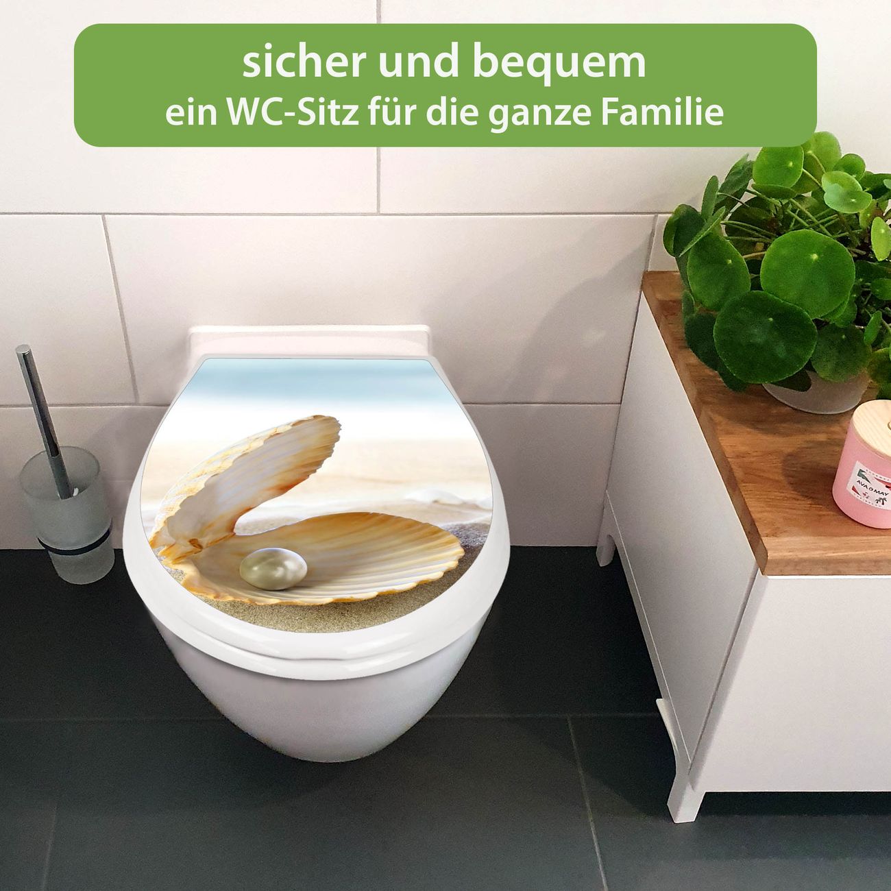 FUNKTION:Mit dem banjado Familien WC Sitz mit Absenkautomatik und dem Motiv Motiv Perlenmuschel verbinden Sie Design mit Funktionalität. Sie erhalten den Toilettendeckel in bewährt guter Qualität mit Montagematerial passend auf alle Euro-WC-Becken. Die Gesamtgröße beträgt 37,1cm x 44,9cm x 5cm, die Grundfarbe ist weiß.</p> DESIGN:Der Klodeckel in weiß mit Motiv Motiv Perlenmuschel hat eine ansprechende Optik, eine besondere Form und ist sehr stabil. Das Motiv besteht aus einer farbbrillianten Motivfolie, die durch ein Schutzlaminat zusätzlich vor Kratzern schützt. Der integrierte Kindersitz fügt sich harmonisch ein. DETAILS:Der Toilettensitz mit Soft Close besteht aus hochwertigem Polypropylen, ist geruchlos, ungiftig und kann mit handelsüblicher Seife gereinigt werden. Die Montage kann von von oben oder von unten erfolgen und ist kinderleicht. NUTZEN:Mit Hilfe der detaillierten Aufbauanleitung ermöglichen wir eine schnelle und unkomplizierte Montage. Die banjado Klobrille ist universell geeignet für alle Euro-WC-Schüsseln. Der Kindersitz kann unkompliziert entfernt werden. BANJADO:Ihr WC-Deckel wird in Sachsen in einer kleinen Manufaktur von Hand veredelt. Die Motivfolie ist lösungsmittelfrei und schutzlaminiert für einen langen Halt. Wir wünschen viel Freude bei der Auswahl eines schönen Motivs.