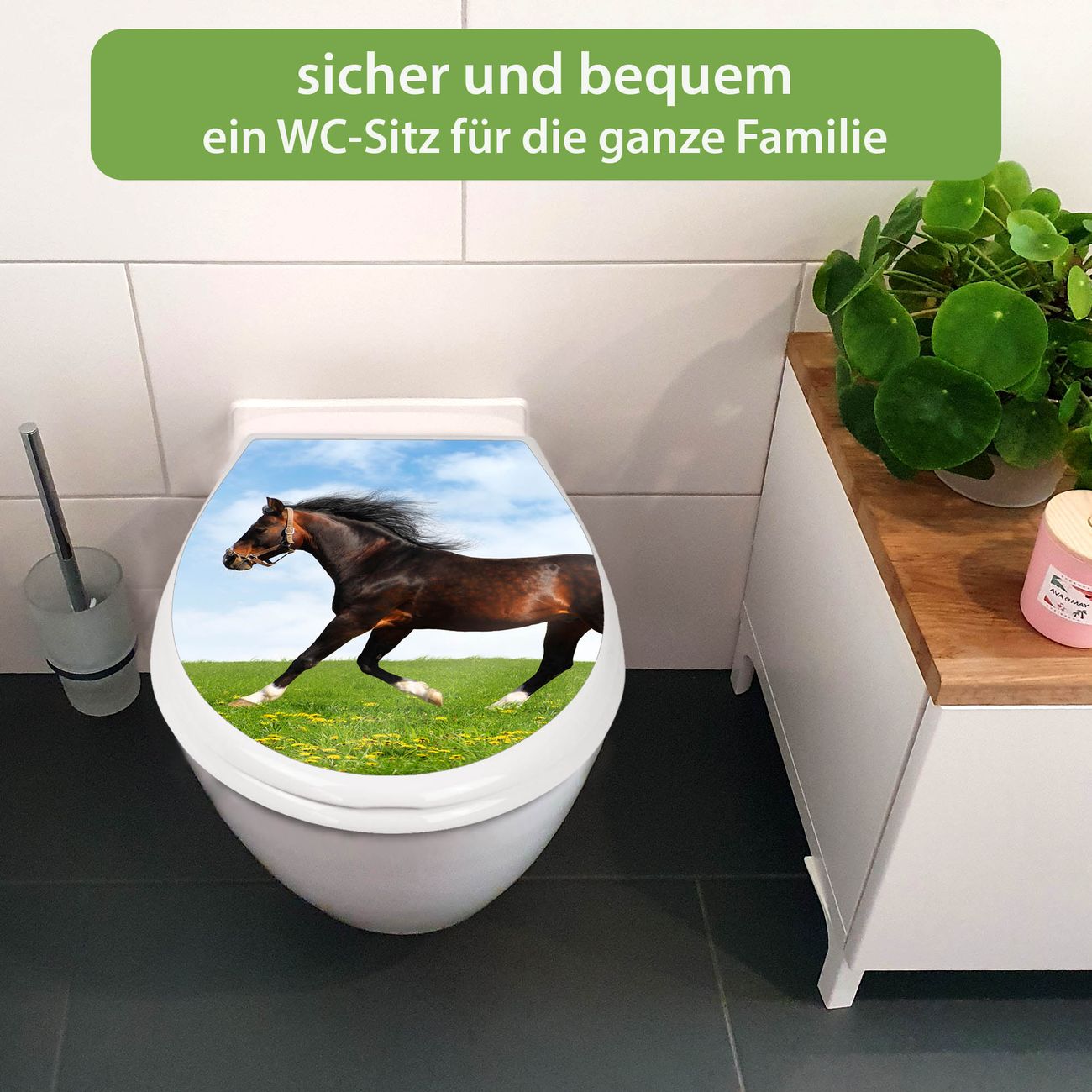 FUNKTION:Mit dem banjado Familien WC Sitz mit Absenkautomatik und dem Motiv Motiv Pferd verbinden Sie Design mit Funktionalität. Sie erhalten den Toilettendeckel in bewährt guter Qualität mit Montagematerial passend auf alle Euro-WC-Becken. Die Gesamtgröße beträgt 37,1cm x 44,9cm x 5cm, die Grundfarbe ist weiß.</p> DESIGN:Der Klodeckel in weiß mit Motiv Motiv Pferd hat eine ansprechende Optik, eine besondere Form und ist sehr stabil. Das Motiv besteht aus einer farbbrillianten Motivfolie, die durch ein Schutzlaminat zusätzlich vor Kratzern schützt. Der integrierte Kindersitz fügt sich harmonisch ein. DETAILS:Der Toilettensitz mit Soft Close besteht aus hochwertigem Polypropylen, ist geruchlos, ungiftig und kann mit handelsüblicher Seife gereinigt werden. Die Montage kann von von oben oder von unten erfolgen und ist kinderleicht. NUTZEN:Mit Hilfe der detaillierten Aufbauanleitung ermöglichen wir eine schnelle und unkomplizierte Montage. Die banjado Klobrille ist universell geeignet für alle Euro-WC-Schüsseln. Der Kindersitz kann unkompliziert entfernt werden. BANJADO:Ihr WC-Deckel wird in Sachsen in einer kleinen Manufaktur von Hand veredelt. Die Motivfolie ist lösungsmittelfrei und schutzlaminiert für einen langen Halt. Wir wünschen viel Freude bei der Auswahl eines schönen Motivs.