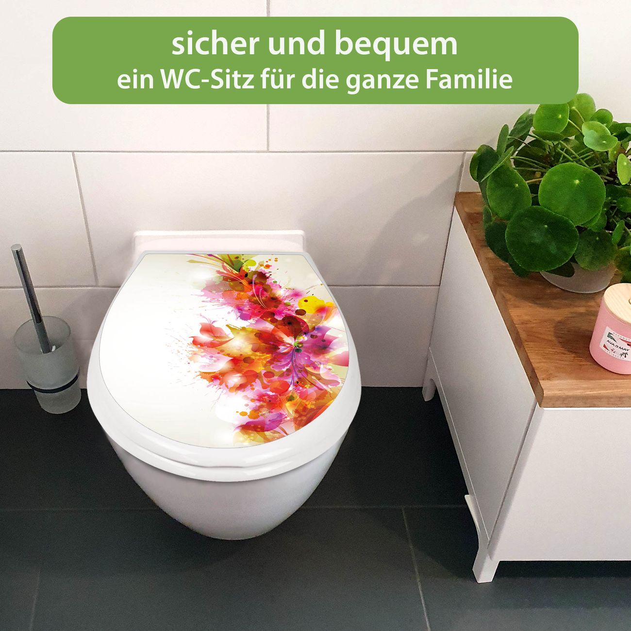 FUNKTION:Mit dem banjado Familien WC Sitz mit Absenkautomatik und dem Motiv Motiv Pink Explosion verbinden Sie Design mit Funktionalität. Sie erhalten den Toilettendeckel in bewährt guter Qualität mit Montagematerial passend auf alle Euro-WC-Becken. Die Gesamtgröße beträgt 37,1cm x 44,9cm x 5cm, die Grundfarbe ist weiß.</p> DESIGN:Der Klodeckel in weiß mit Motiv Motiv Pink Explosion hat eine ansprechende Optik, eine besondere Form und ist sehr stabil. Das Motiv besteht aus einer farbbrillianten Motivfolie, die durch ein Schutzlaminat zusätzlich vor Kratzern schützt. Der integrierte Kindersitz fügt sich harmonisch ein. DETAILS:Der Toilettensitz mit Soft Close besteht aus hochwertigem Polypropylen, ist geruchlos, ungiftig und kann mit handelsüblicher Seife gereinigt werden. Die Montage kann von von oben oder von unten erfolgen und ist kinderleicht. NUTZEN:Mit Hilfe der detaillierten Aufbauanleitung ermöglichen wir eine schnelle und unkomplizierte Montage. Die banjado Klobrille ist universell geeignet für alle Euro-WC-Schüsseln. Der Kindersitz kann unkompliziert entfernt werden. BANJADO:Ihr WC-Deckel wird in Sachsen in einer kleinen Manufaktur von Hand veredelt. Die Motivfolie ist lösungsmittelfrei und schutzlaminiert für einen langen Halt. Wir wünschen viel Freude bei der Auswahl eines schönen Motivs.
