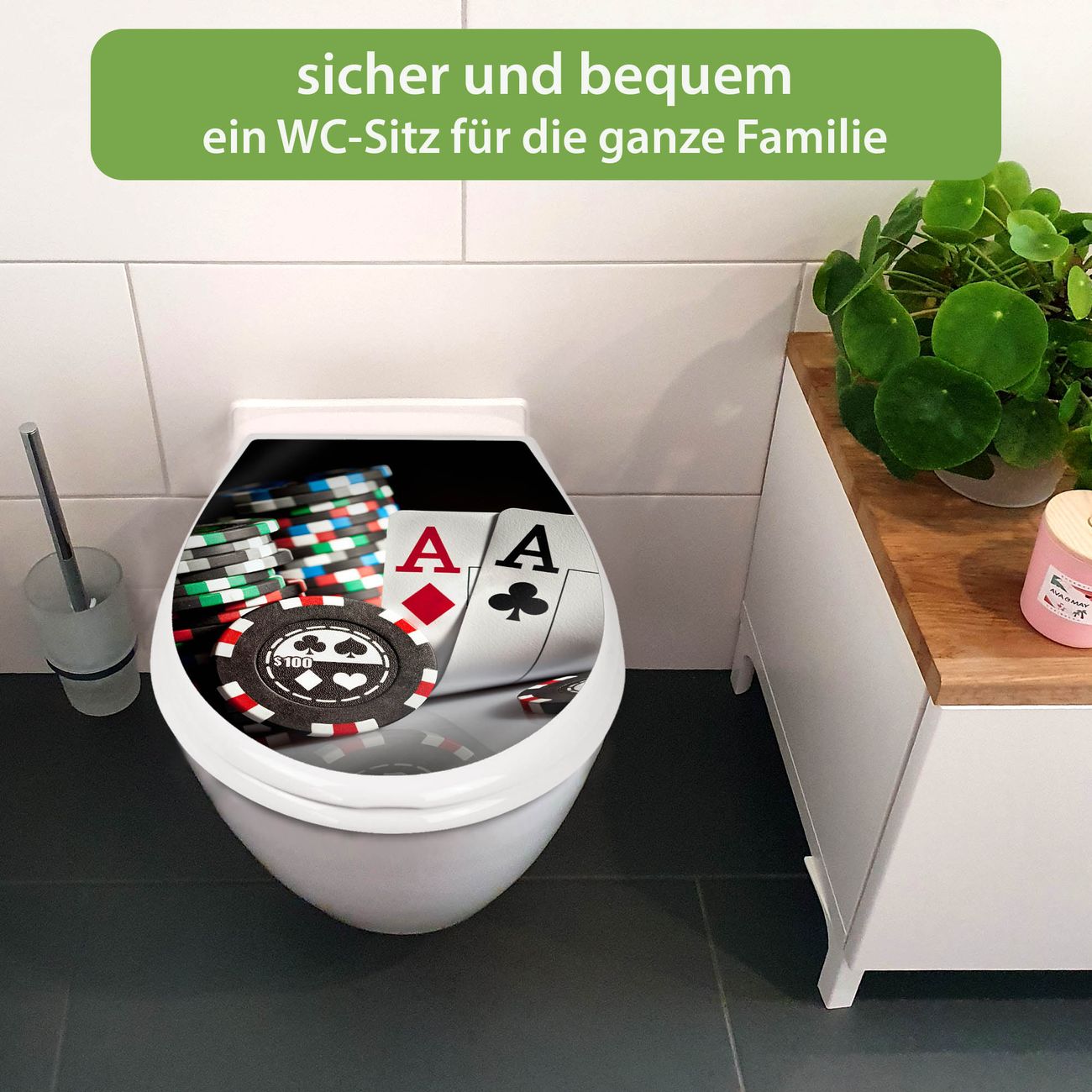 FUNKTION:Mit dem banjado Familien WC Sitz mit Absenkautomatik und dem Motiv Motiv Poker verbinden Sie Design mit Funktionalität. Sie erhalten den Toilettendeckel in bewährt guter Qualität mit Montagematerial passend auf alle Euro-WC-Becken. Die Gesamtgröße beträgt 37,1cm x 44,9cm x 5cm, die Grundfarbe ist weiß.</p> DESIGN:Der Klodeckel in weiß mit Motiv Motiv Poker hat eine ansprechende Optik, eine besondere Form und ist sehr stabil. Das Motiv besteht aus einer farbbrillianten Motivfolie, die durch ein Schutzlaminat zusätzlich vor Kratzern schützt. Der integrierte Kindersitz fügt sich harmonisch ein. DETAILS:Der Toilettensitz mit Soft Close besteht aus hochwertigem Polypropylen, ist geruchlos, ungiftig und kann mit handelsüblicher Seife gereinigt werden. Die Montage kann von von oben oder von unten erfolgen und ist kinderleicht. NUTZEN:Mit Hilfe der detaillierten Aufbauanleitung ermöglichen wir eine schnelle und unkomplizierte Montage. Die banjado Klobrille ist universell geeignet für alle Euro-WC-Schüsseln. Der Kindersitz kann unkompliziert entfernt werden. BANJADO:Ihr WC-Deckel wird in Sachsen in einer kleinen Manufaktur von Hand veredelt. Die Motivfolie ist lösungsmittelfrei und schutzlaminiert für einen langen Halt. Wir wünschen viel Freude bei der Auswahl eines schönen Motivs.