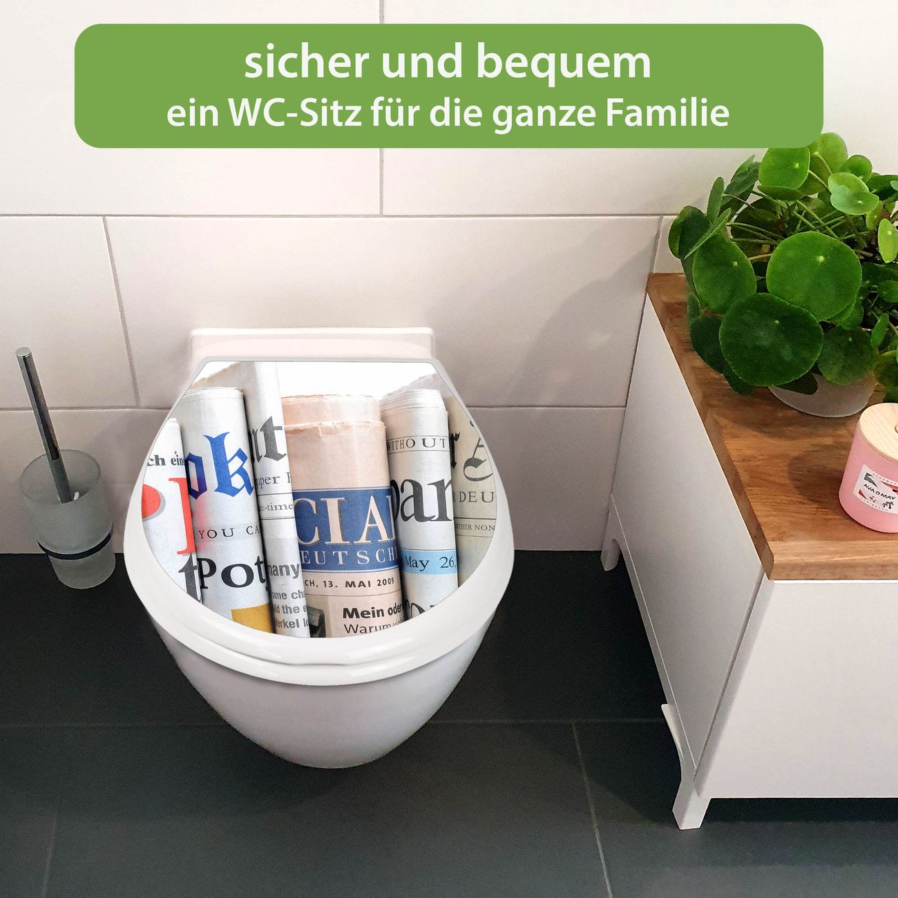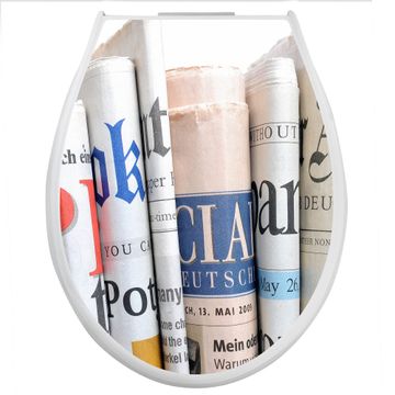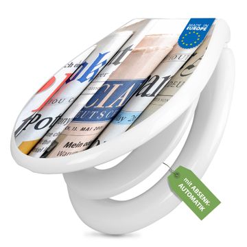FUNKTION:Mit dem banjado Familien WC Sitz mit Absenkautomatik und dem Motiv Motiv Presse verbinden Sie Design mit Funktionalität. Sie erhalten den Toilettendeckel in bewährt guter Qualität mit Montagematerial passend auf alle Euro-WC-Becken. Die Gesamtgröße beträgt 37,1cm x 44,9cm x 5cm, die Grundfarbe ist weiß.</p> DESIGN:Der Klodeckel in weiß mit Motiv Motiv Presse hat eine ansprechende Optik, eine besondere Form und ist sehr stabil. Das Motiv besteht aus einer farbbrillianten Motivfolie, die durch ein Schutzlaminat zusätzlich vor Kratzern schützt. Der integrierte Kindersitz fügt sich harmonisch ein. DETAILS:Der Toilettensitz mit Soft Close besteht aus hochwertigem Polypropylen, ist geruchlos, ungiftig und kann mit handelsüblicher Seife gereinigt werden. Die Montage kann von von oben oder von unten erfolgen und ist kinderleicht. NUTZEN:Mit Hilfe der detaillierten Aufbauanleitung ermöglichen wir eine schnelle und unkomplizierte Montage. Die banjado Klobrille ist universell geeignet für alle Euro-WC-Schüsseln. Der Kindersitz kann unkompliziert entfernt werden. BANJADO:Ihr WC-Deckel wird in Sachsen in einer kleinen Manufaktur von Hand veredelt. Die Motivfolie ist lösungsmittelfrei und schutzlaminiert für einen langen Halt. Wir wünschen viel Freude bei der Auswahl eines schönen Motivs.