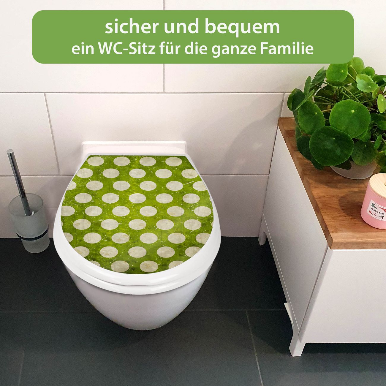 FUNKTION:Mit dem banjado Familien WC Sitz mit Absenkautomatik und dem Motiv Motiv Punkte Grün Vintage verbinden Sie Design mit Funktionalität. Sie erhalten den Toilettendeckel in bewährt guter Qualität mit Montagematerial passend auf alle Euro-WC-Becken. Die Gesamtgröße beträgt 37,1cm x 44,9cm x 5cm, die Grundfarbe ist weiß.</p> DESIGN:Der Klodeckel in weiß mit Motiv Motiv Punkte Grün Vintage hat eine ansprechende Optik, eine besondere Form und ist sehr stabil. Das Motiv besteht aus einer farbbrillianten Motivfolie, die durch ein Schutzlaminat zusätzlich vor Kratzern schützt. Der integrierte Kindersitz fügt sich harmonisch ein. DETAILS:Der Toilettensitz mit Soft Close besteht aus hochwertigem Polypropylen, ist geruchlos, ungiftig und kann mit handelsüblicher Seife gereinigt werden. Die Montage kann von von oben oder von unten erfolgen und ist kinderleicht. NUTZEN:Mit Hilfe der detaillierten Aufbauanleitung ermöglichen wir eine schnelle und unkomplizierte Montage. Die banjado Klobrille ist universell geeignet für alle Euro-WC-Schüsseln. Der Kindersitz kann unkompliziert entfernt werden. BANJADO:Ihr WC-Deckel wird in Sachsen in einer kleinen Manufaktur von Hand veredelt. Die Motivfolie ist lösungsmittelfrei und schutzlaminiert für einen langen Halt. Wir wünschen viel Freude bei der Auswahl eines schönen Motivs.