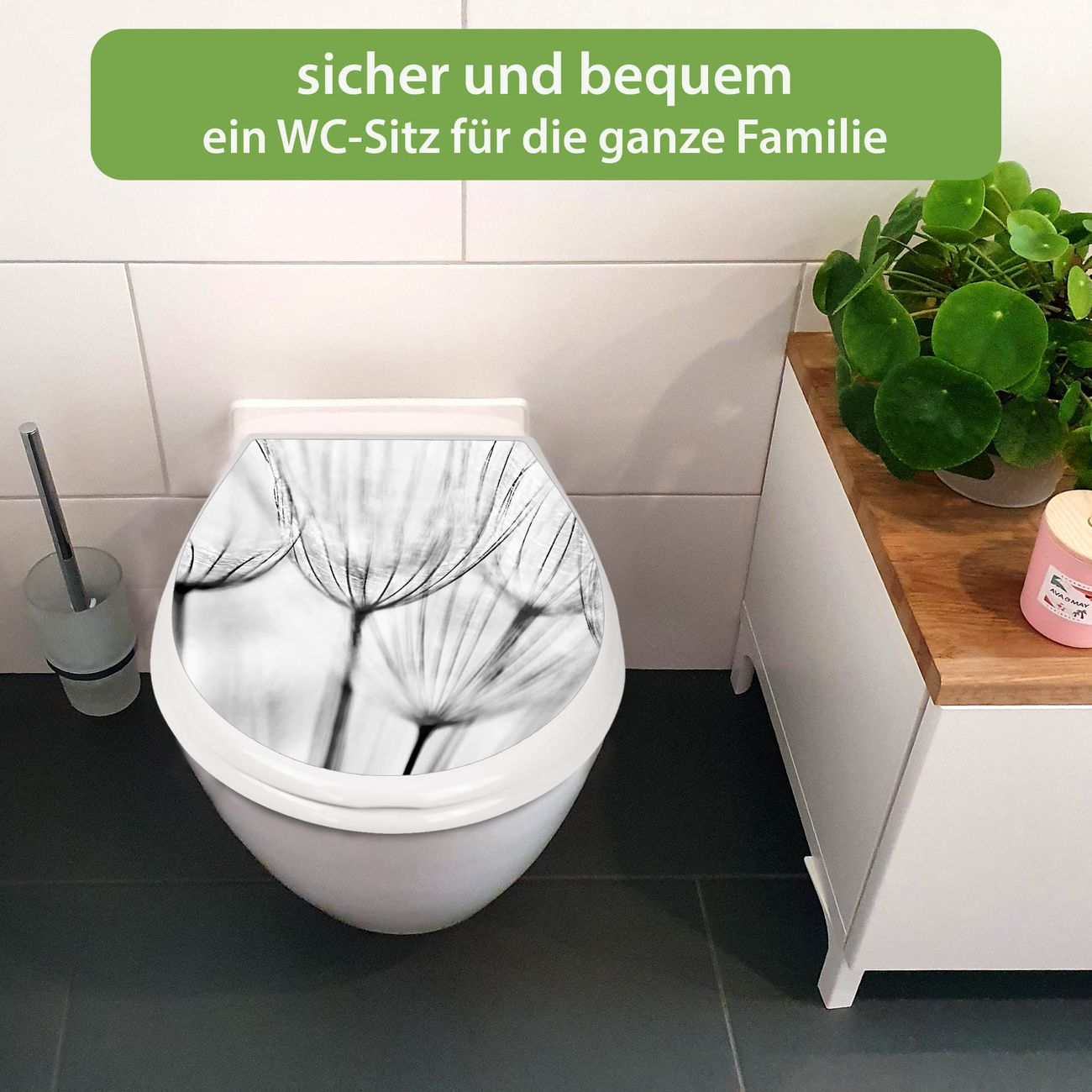 FUNKTION:Mit dem banjado Familien WC Sitz mit Absenkautomatik und dem Motiv Motiv Pusteblumen SW verbinden Sie Design mit Funktionalität. Sie erhalten den Toilettendeckel in bewährt guter Qualität mit Montagematerial passend auf alle Euro-WC-Becken. Die Gesamtgröße beträgt 37,1cm x 44,9cm x 5cm, die Grundfarbe ist weiß.</p> DESIGN:Der Klodeckel in weiß mit Motiv Motiv Pusteblumen SW hat eine ansprechende Optik, eine besondere Form und ist sehr stabil. Das Motiv besteht aus einer farbbrillianten Motivfolie, die durch ein Schutzlaminat zusätzlich vor Kratzern schützt. Der integrierte Kindersitz fügt sich harmonisch ein. DETAILS:Der Toilettensitz mit Soft Close besteht aus hochwertigem Polypropylen, ist geruchlos, ungiftig und kann mit handelsüblicher Seife gereinigt werden. Die Montage kann von von oben oder von unten erfolgen und ist kinderleicht. NUTZEN:Mit Hilfe der detaillierten Aufbauanleitung ermöglichen wir eine schnelle und unkomplizierte Montage. Die banjado Klobrille ist universell geeignet für alle Euro-WC-Schüsseln. Der Kindersitz kann unkompliziert entfernt werden. BANJADO:Ihr WC-Deckel wird in Sachsen in einer kleinen Manufaktur von Hand veredelt. Die Motivfolie ist lösungsmittelfrei und schutzlaminiert für einen langen Halt. Wir wünschen viel Freude bei der Auswahl eines schönen Motivs.