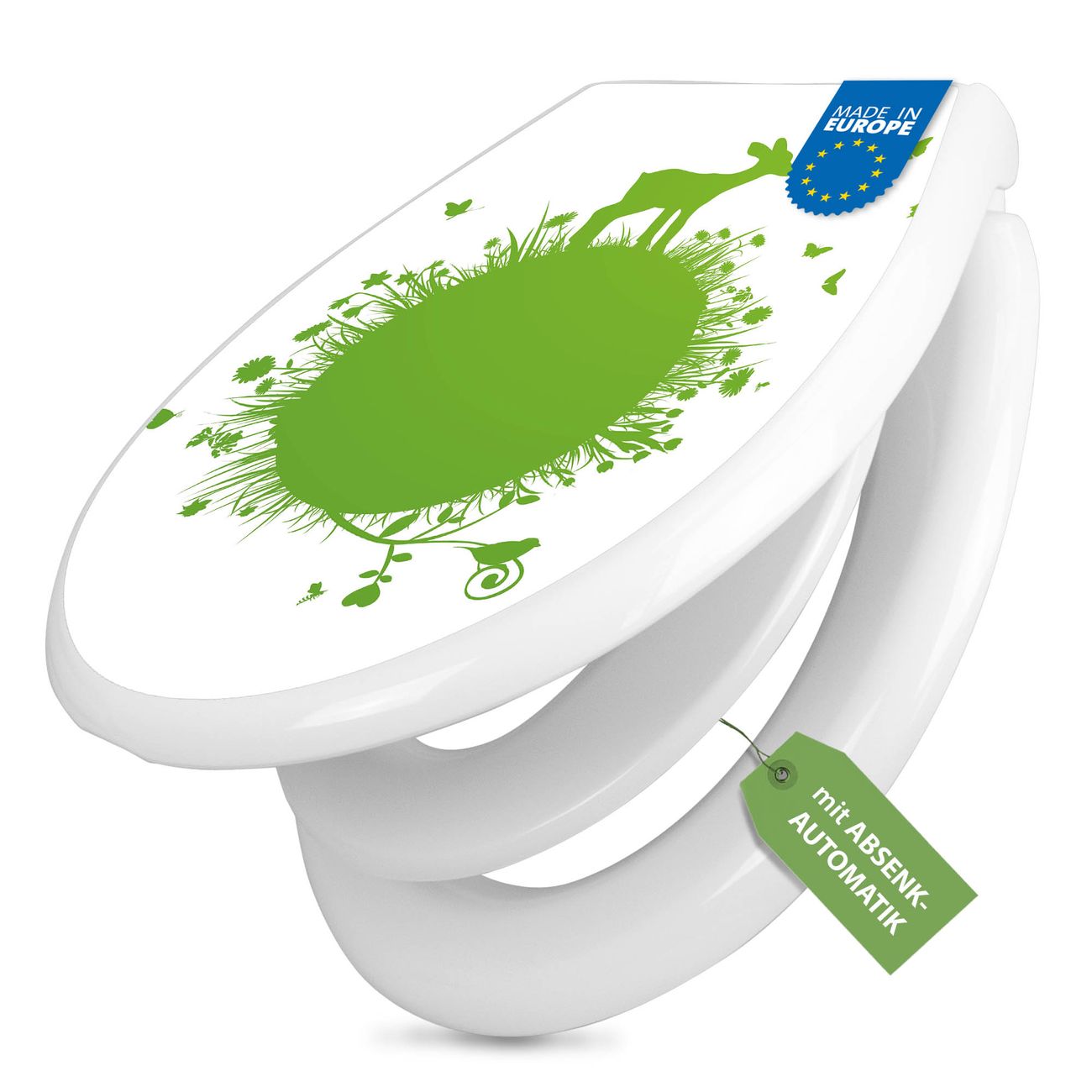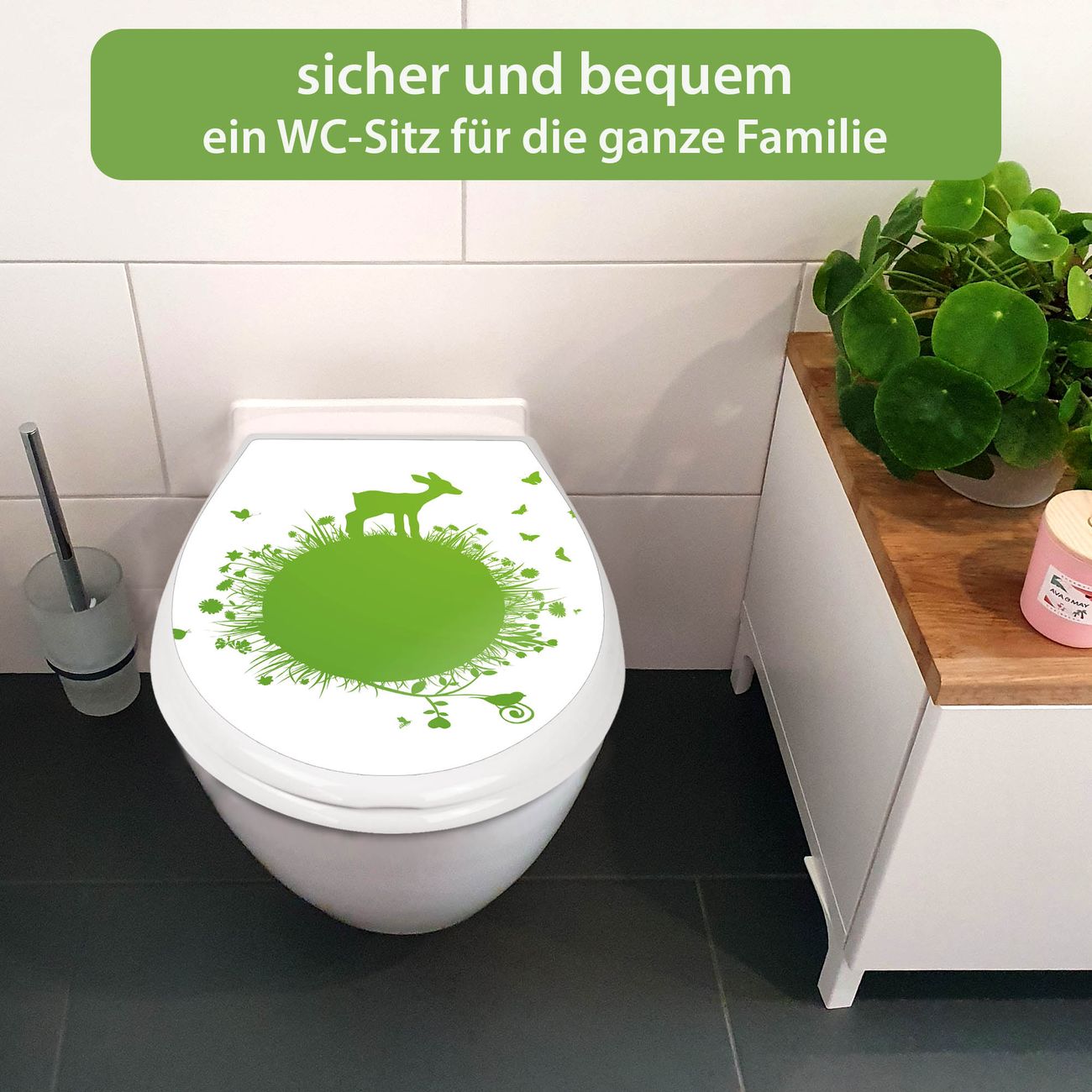 FUNKTION:Mit dem banjado Familien WC Sitz mit Absenkautomatik und dem Motiv Motiv Rehkitz verbinden Sie Design mit Funktionalität. Sie erhalten den Toilettendeckel in bewährt guter Qualität mit Montagematerial passend auf alle Euro-WC-Becken. Die Gesamtgröße beträgt 37,1cm x 44,9cm x 5cm, die Grundfarbe ist weiß.</p> DESIGN:Der Klodeckel in weiß mit Motiv Motiv Rehkitz hat eine ansprechende Optik, eine besondere Form und ist sehr stabil. Das Motiv besteht aus einer farbbrillianten Motivfolie, die durch ein Schutzlaminat zusätzlich vor Kratzern schützt. Der integrierte Kindersitz fügt sich harmonisch ein. DETAILS:Der Toilettensitz mit Soft Close besteht aus hochwertigem Polypropylen, ist geruchlos, ungiftig und kann mit handelsüblicher Seife gereinigt werden. Die Montage kann von von oben oder von unten erfolgen und ist kinderleicht. NUTZEN:Mit Hilfe der detaillierten Aufbauanleitung ermöglichen wir eine schnelle und unkomplizierte Montage. Die banjado Klobrille ist universell geeignet für alle Euro-WC-Schüsseln. Der Kindersitz kann unkompliziert entfernt werden. BANJADO:Ihr WC-Deckel wird in Sachsen in einer kleinen Manufaktur von Hand veredelt. Die Motivfolie ist lösungsmittelfrei und schutzlaminiert für einen langen Halt. Wir wünschen viel Freude bei der Auswahl eines schönen Motivs.