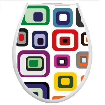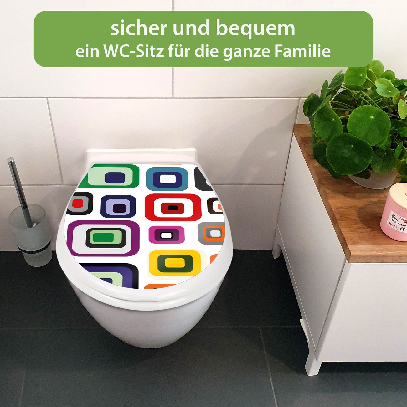 FUNKTION:Mit dem banjado Familien WC Sitz mit Absenkautomatik und dem Motiv Motiv Retro 2 verbinden Sie Design mit Funktionalität. Sie erhalten den Toilettendeckel in bewährt guter Qualität mit Montagematerial passend auf alle Euro-WC-Becken. Die Gesamtgröße beträgt 37,1cm x 44,9cm x 5cm, die Grundfarbe ist weiß.</p> DESIGN:Der Klodeckel in weiß mit Motiv Motiv Retro 2 hat eine ansprechende Optik, eine besondere Form und ist sehr stabil. Das Motiv besteht aus einer farbbrillianten Motivfolie, die durch ein Schutzlaminat zusätzlich vor Kratzern schützt. Der integrierte Kindersitz fügt sich harmonisch ein. DETAILS:Der Toilettensitz mit Soft Close besteht aus hochwertigem Polypropylen, ist geruchlos, ungiftig und kann mit handelsüblicher Seife gereinigt werden. Die Montage kann von von oben oder von unten erfolgen und ist kinderleicht. NUTZEN:Mit Hilfe der detaillierten Aufbauanleitung ermöglichen wir eine schnelle und unkomplizierte Montage. Die banjado Klobrille ist universell geeignet für alle Euro-WC-Schüsseln. Der Kindersitz kann unkompliziert entfernt werden. BANJADO:Ihr WC-Deckel wird in Sachsen in einer kleinen Manufaktur von Hand veredelt. Die Motivfolie ist lösungsmittelfrei und schutzlaminiert für einen langen Halt. Wir wünschen viel Freude bei der Auswahl eines schönen Motivs.