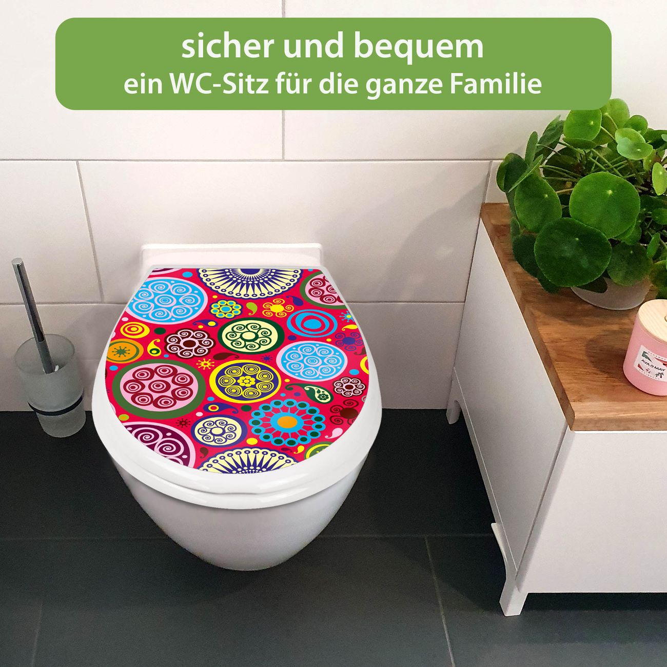 FUNKTION:Mit dem banjado Familien WC Sitz mit Absenkautomatik und dem Motiv Motiv Retro Kreise verbinden Sie Design mit Funktionalität. Sie erhalten den Toilettendeckel in bewährt guter Qualität mit Montagematerial passend auf alle Euro-WC-Becken. Die Gesamtgröße beträgt 37,1cm x 44,9cm x 5cm, die Grundfarbe ist weiß.</p> DESIGN:Der Klodeckel in weiß mit Motiv Motiv Retro Kreise hat eine ansprechende Optik, eine besondere Form und ist sehr stabil. Das Motiv besteht aus einer farbbrillianten Motivfolie, die durch ein Schutzlaminat zusätzlich vor Kratzern schützt. Der integrierte Kindersitz fügt sich harmonisch ein. DETAILS:Der Toilettensitz mit Soft Close besteht aus hochwertigem Polypropylen, ist geruchlos, ungiftig und kann mit handelsüblicher Seife gereinigt werden. Die Montage kann von von oben oder von unten erfolgen und ist kinderleicht. NUTZEN:Mit Hilfe der detaillierten Aufbauanleitung ermöglichen wir eine schnelle und unkomplizierte Montage. Die banjado Klobrille ist universell geeignet für alle Euro-WC-Schüsseln. Der Kindersitz kann unkompliziert entfernt werden. BANJADO:Ihr WC-Deckel wird in Sachsen in einer kleinen Manufaktur von Hand veredelt. Die Motivfolie ist lösungsmittelfrei und schutzlaminiert für einen langen Halt. Wir wünschen viel Freude bei der Auswahl eines schönen Motivs.