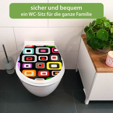 FUNKTION:Mit dem banjado Familien WC Sitz mit Absenkautomatik und dem Motiv Motiv Retro verbinden Sie Design mit Funktionalität. Sie erhalten den Toilettendeckel in bewährt guter Qualität mit Montagematerial passend auf alle Euro-WC-Becken. Die Gesamtgröße beträgt 37,1cm x 44,9cm x 5cm, die Grundfarbe ist weiß.</p> DESIGN:Der Klodeckel in weiß mit Motiv Motiv Retro hat eine ansprechende Optik, eine besondere Form und ist sehr stabil. Das Motiv besteht aus einer farbbrillianten Motivfolie, die durch ein Schutzlaminat zusätzlich vor Kratzern schützt. Der integrierte Kindersitz fügt sich harmonisch ein. DETAILS:Der Toilettensitz mit Soft Close besteht aus hochwertigem Polypropylen, ist geruchlos, ungiftig und kann mit handelsüblicher Seife gereinigt werden. Die Montage kann von von oben oder von unten erfolgen und ist kinderleicht. NUTZEN:Mit Hilfe der detaillierten Aufbauanleitung ermöglichen wir eine schnelle und unkomplizierte Montage. Die banjado Klobrille ist universell geeignet für alle Euro-WC-Schüsseln. Der Kindersitz kann unkompliziert entfernt werden. BANJADO:Ihr WC-Deckel wird in Sachsen in einer kleinen Manufaktur von Hand veredelt. Die Motivfolie ist lösungsmittelfrei und schutzlaminiert für einen langen Halt. Wir wünschen viel Freude bei der Auswahl eines schönen Motivs.