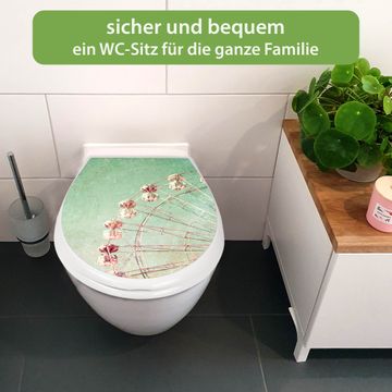 FUNKTION:Mit dem banjado Familien WC Sitz mit Absenkautomatik und dem Motiv Motiv Riesenrad 1 verbinden Sie Design mit Funktionalität. Sie erhalten den Toilettendeckel in bewährt guter Qualität mit Montagematerial passend auf alle Euro-WC-Becken. Die Gesamtgröße beträgt 37,1cm x 44,9cm x 5cm, die Grundfarbe ist weiß.</p> DESIGN:Der Klodeckel in weiß mit Motiv Motiv Riesenrad 1 hat eine ansprechende Optik, eine besondere Form und ist sehr stabil. Das Motiv besteht aus einer farbbrillianten Motivfolie, die durch ein Schutzlaminat zusätzlich vor Kratzern schützt. Der integrierte Kindersitz fügt sich harmonisch ein. DETAILS:Der Toilettensitz mit Soft Close besteht aus hochwertigem Polypropylen, ist geruchlos, ungiftig und kann mit handelsüblicher Seife gereinigt werden. Die Montage kann von von oben oder von unten erfolgen und ist kinderleicht. NUTZEN:Mit Hilfe der detaillierten Aufbauanleitung ermöglichen wir eine schnelle und unkomplizierte Montage. Die banjado Klobrille ist universell geeignet für alle Euro-WC-Schüsseln. Der Kindersitz kann unkompliziert entfernt werden. BANJADO:Ihr WC-Deckel wird in Sachsen in einer kleinen Manufaktur von Hand veredelt. Die Motivfolie ist lösungsmittelfrei und schutzlaminiert für einen langen Halt. Wir wünschen viel Freude bei der Auswahl eines schönen Motivs.