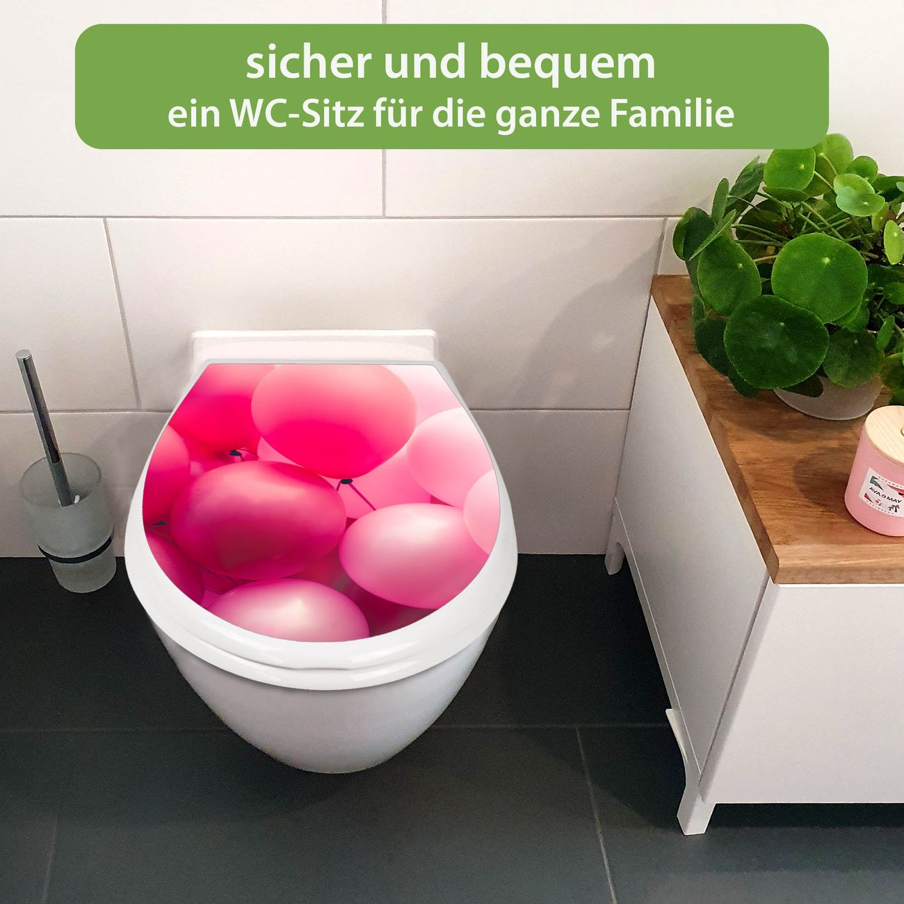 FUNKTION:Mit dem banjado Familien WC Sitz mit Absenkautomatik und dem Motiv Motiv Rosa Ballons 2 verbinden Sie Design mit Funktionalität. Sie erhalten den Toilettendeckel in bewährt guter Qualität mit Montagematerial passend auf alle Euro-WC-Becken. Die Gesamtgröße beträgt 37,1cm x 44,9cm x 5cm, die Grundfarbe ist weiß.</p> DESIGN:Der Klodeckel in weiß mit Motiv Motiv Rosa Ballons 2 hat eine ansprechende Optik, eine besondere Form und ist sehr stabil. Das Motiv besteht aus einer farbbrillianten Motivfolie, die durch ein Schutzlaminat zusätzlich vor Kratzern schützt. Der integrierte Kindersitz fügt sich harmonisch ein. DETAILS:Der Toilettensitz mit Soft Close besteht aus hochwertigem Polypropylen, ist geruchlos, ungiftig und kann mit handelsüblicher Seife gereinigt werden. Die Montage kann von von oben oder von unten erfolgen und ist kinderleicht. NUTZEN:Mit Hilfe der detaillierten Aufbauanleitung ermöglichen wir eine schnelle und unkomplizierte Montage. Die banjado Klobrille ist universell geeignet für alle Euro-WC-Schüsseln. Der Kindersitz kann unkompliziert entfernt werden. BANJADO:Ihr WC-Deckel wird in Sachsen in einer kleinen Manufaktur von Hand veredelt. Die Motivfolie ist lösungsmittelfrei und schutzlaminiert für einen langen Halt. Wir wünschen viel Freude bei der Auswahl eines schönen Motivs.
