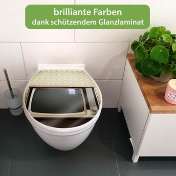 FUNKTION: Mit dem banjado Toilettendeckel mit Absenkautomatik verbinden Sie Design mit Funktionalität. Sie erhalten den WC Sitz in bewährt guter Qualität mit Edelstahl Scharnieren und Montagematerial. DESIGN: Der Klodeckel hat eine ansprechende Optik, eine besondere Form und ist sehr stabil. Das Motiv besteht aus einer farbbrillianten Motivfolie, die durch ein Schutzlaminat zusätzlich vor Kratzern schützt. DETAILS: Der Toilettensitz besteht aus Duroplast, die Scharniere sind aus hochwertigem Edelstahl, Materialien die Ihnen eine leichte und hygienische Reinigung ermöglichen. Die Gesamtgröße beträgt 37,3cm x 45cm x 5cm, die Grundfarbe ist weiß. NUTZEN: Mit Hilfe der detaillierten Aufbauanleitung ermöglichen wir eine schnelle und unkomplizierte Montage. Die banjado Klobrille ist universell geeignet für alle gängigen WC Schüsseln. Der Lochabstand zur Befestigung kann variable eingestellt werden. BANJADO: Ihr WC-Deckel wird in Sachsen in einer kleinen Manufaktur von Hand veredelt. Die Motivfolie ist lösungsmittelfrei und schutzlaminiert, für einen langen Halt. Wir wünschen viel Freude bei der Auswahl eines schönen Motivs.