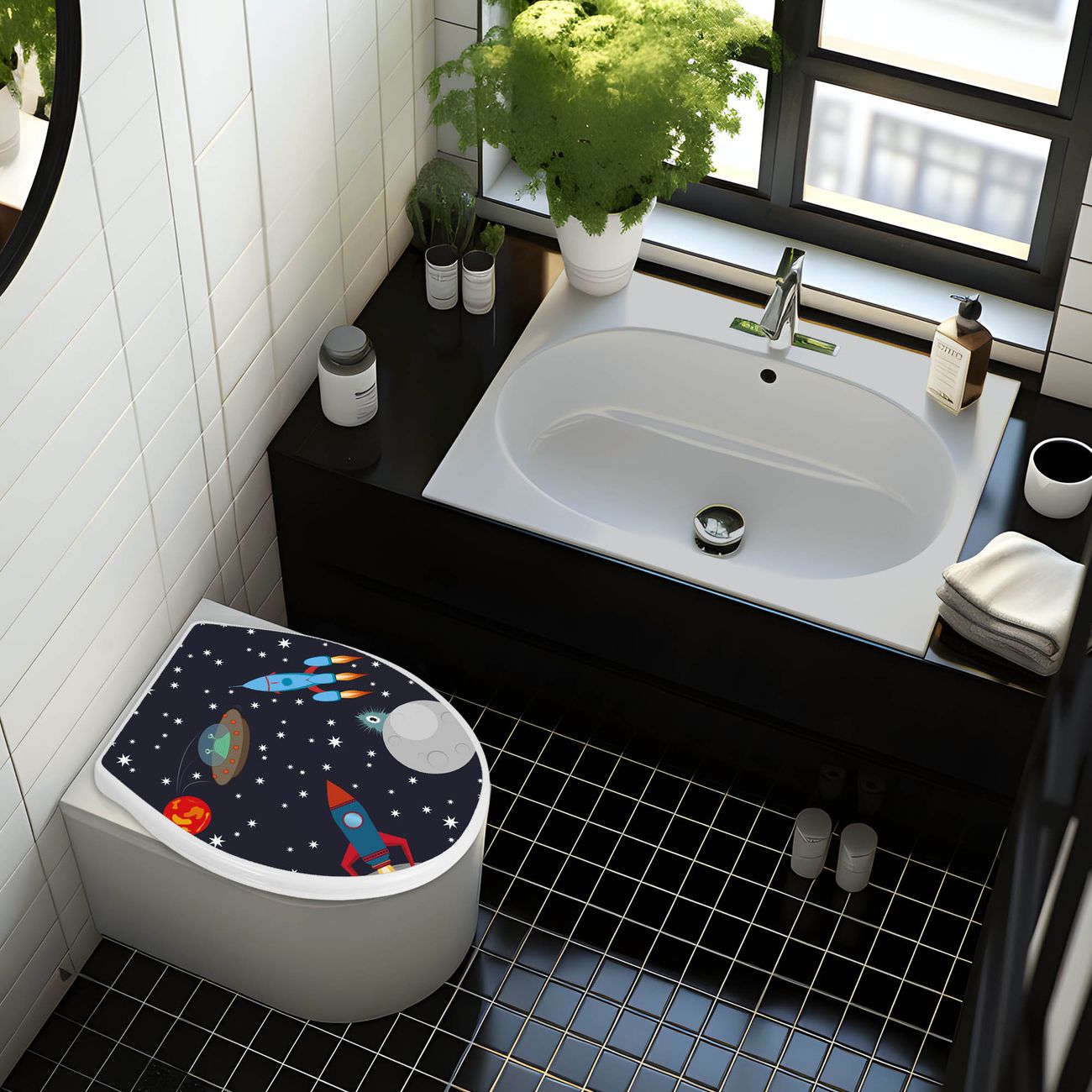FUNKTION:Mit dem banjado Familien WC Sitz mit Absenkautomatik und dem Motiv Space Traffic verbinden Sie Design mit Funktionalität. Sie erhalten den Toilettendeckel in bewährt guter Qualität mit Montagematerial passend auf alle Euro-WC-Becken. Die Gesamtgröße beträgt 37cm x 44,5cm x 5cm, die Grundfarbe ist weiß.</p> DESIGN:Der Klodeckel in weiß mit Motiv Space Traffic hat eine ansprechende Optik, eine besondere Form und ist sehr stabil. Das Motiv besteht aus einer farbbrillianten Motivfolie, die durch ein Schutzlaminat zusätzlich vor Kratzern schützt. Der integrierte Kindersitz fügt sich harmonisch ein. DETAILS:Der Toilettensitz mit Soft Close besteht aus hochwertigem Polypropylen, ist geruchlos, ungiftig und kann mit handelsüblicher Seife gereinigt werden. Die Montage kann von von oben oder von unten erfolgen und ist kinderleicht. NUTZEN:Mit Hilfe der detaillierten Aufbauanleitung ermöglichen wir eine schnelle und unkomplizierte Montage. Die banjado Klobrille ist universell geeignet für alle Euro-WC-Schüsseln. Der Kindersitz kann unkompliziert entfernt werden. BANJADO:Ihr WC-Deckel wird in Sachsen in einer kleinen Manufaktur von Hand veredelt. Die Motivfolie ist lösungsmittelfrei und schutzlaminiert für einen langen Halt. Wir wünschen viel Freude bei der Auswahl eines schönen Motivs.