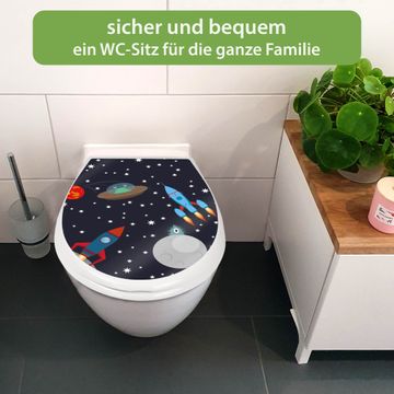 FUNKTION:Mit dem banjado Familien WC Sitz mit Absenkautomatik und dem Motiv Motiv Space Traffic verbinden Sie Design mit Funktionalität. Sie erhalten den Toilettendeckel in bewährt guter Qualität mit Montagematerial passend auf alle Euro-WC-Becken. Die Gesamtgröße beträgt 37,1cm x 44,9cm x 5cm, die Grundfarbe ist weiß.</p> DESIGN:Der Klodeckel in weiß mit Motiv Motiv Space Traffic hat eine ansprechende Optik, eine besondere Form und ist sehr stabil. Das Motiv besteht aus einer farbbrillianten Motivfolie, die durch ein Schutzlaminat zusätzlich vor Kratzern schützt. Der integrierte Kindersitz fügt sich harmonisch ein. DETAILS:Der Toilettensitz mit Soft Close besteht aus hochwertigem Polypropylen, ist geruchlos, ungiftig und kann mit handelsüblicher Seife gereinigt werden. Die Montage kann von von oben oder von unten erfolgen und ist kinderleicht. NUTZEN:Mit Hilfe der detaillierten Aufbauanleitung ermöglichen wir eine schnelle und unkomplizierte Montage. Die banjado Klobrille ist universell geeignet für alle Euro-WC-Schüsseln. Der Kindersitz kann unkompliziert entfernt werden. BANJADO:Ihr WC-Deckel wird in Sachsen in einer kleinen Manufaktur von Hand veredelt. Die Motivfolie ist lösungsmittelfrei und schutzlaminiert für einen langen Halt. Wir wünschen viel Freude bei der Auswahl eines schönen Motivs.