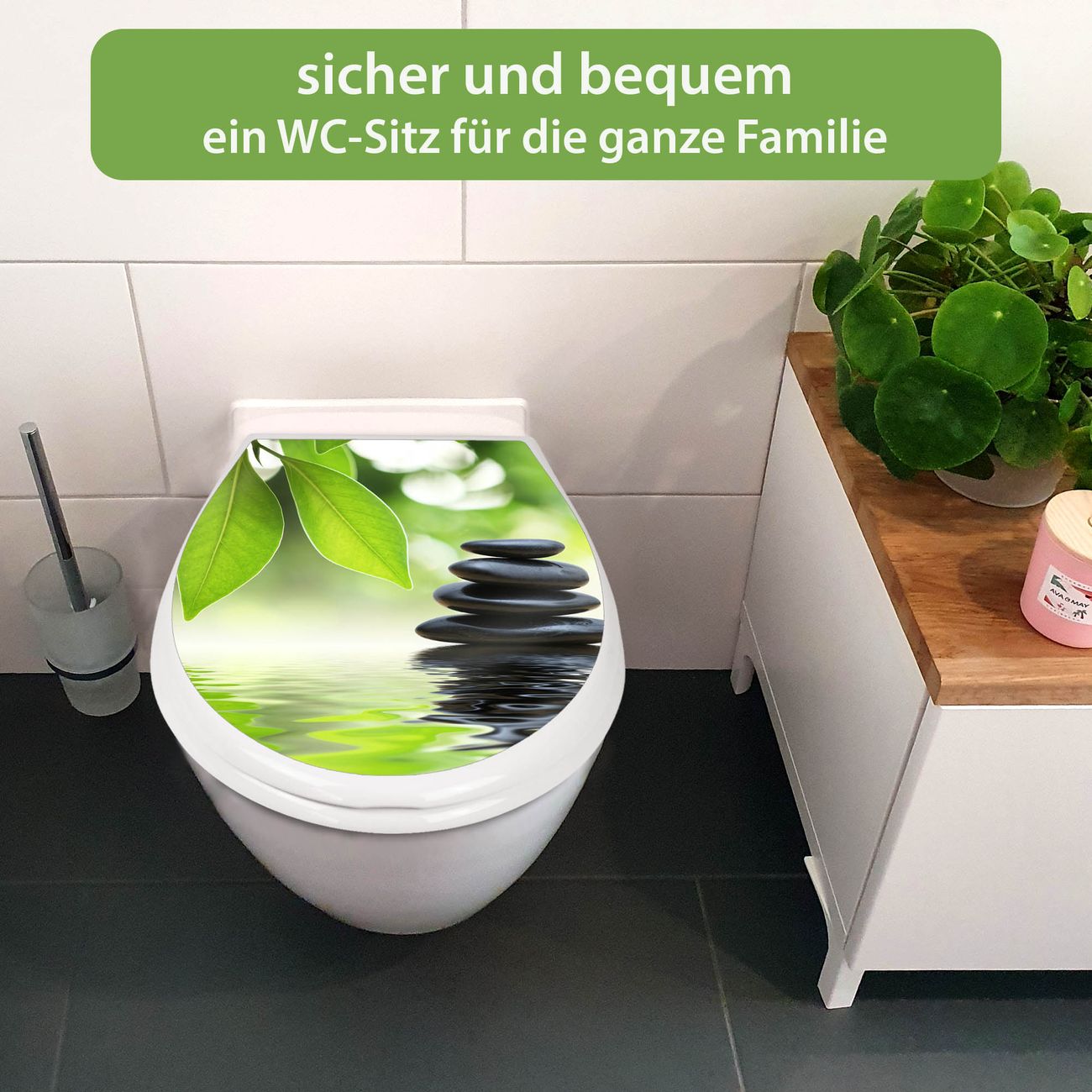 FUNKTION:Mit dem banjado Familien WC Sitz mit Absenkautomatik und dem Motiv Motiv Steine&Relax verbinden Sie Design mit Funktionalität. Sie erhalten den Toilettendeckel in bewährt guter Qualität mit Montagematerial passend auf alle Euro-WC-Becken. Die Gesamtgröße beträgt 37,1cm x 44,9cm x 5cm, die Grundfarbe ist weiß.</p> DESIGN:Der Klodeckel in weiß mit Motiv Motiv Steine&Relax hat eine ansprechende Optik, eine besondere Form und ist sehr stabil. Das Motiv besteht aus einer farbbrillianten Motivfolie, die durch ein Schutzlaminat zusätzlich vor Kratzern schützt. Der integrierte Kindersitz fügt sich harmonisch ein. DETAILS:Der Toilettensitz mit Soft Close besteht aus hochwertigem Polypropylen, ist geruchlos, ungiftig und kann mit handelsüblicher Seife gereinigt werden. Die Montage kann von von oben oder von unten erfolgen und ist kinderleicht. NUTZEN:Mit Hilfe der detaillierten Aufbauanleitung ermöglichen wir eine schnelle und unkomplizierte Montage. Die banjado Klobrille ist universell geeignet für alle Euro-WC-Schüsseln. Der Kindersitz kann unkompliziert entfernt werden. BANJADO:Ihr WC-Deckel wird in Sachsen in einer kleinen Manufaktur von Hand veredelt. Die Motivfolie ist lösungsmittelfrei und schutzlaminiert für einen langen Halt. Wir wünschen viel Freude bei der Auswahl eines schönen Motivs.