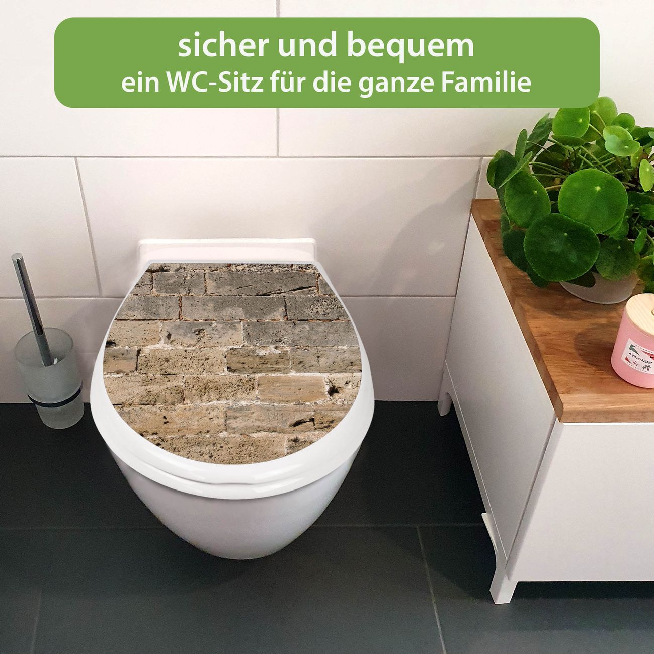 FUNKTION:Mit dem banjado Familien WC Sitz mit Absenkautomatik und dem Motiv Motiv Steinwand Antik verbinden Sie Design mit Funktionalität. Sie erhalten den Toilettendeckel in bewährt guter Qualität mit Montagematerial passend auf alle Euro-WC-Becken. Die Gesamtgröße beträgt 37,1cm x 44,9cm x 5cm, die Grundfarbe ist weiß.</p> DESIGN:Der Klodeckel in weiß mit Motiv Motiv Steinwand Antik hat eine ansprechende Optik, eine besondere Form und ist sehr stabil. Das Motiv besteht aus einer farbbrillianten Motivfolie, die durch ein Schutzlaminat zusätzlich vor Kratzern schützt. Der integrierte Kindersitz fügt sich harmonisch ein. DETAILS:Der Toilettensitz mit Soft Close besteht aus hochwertigem Polypropylen, ist geruchlos, ungiftig und kann mit handelsüblicher Seife gereinigt werden. Die Montage kann von von oben oder von unten erfolgen und ist kinderleicht. NUTZEN:Mit Hilfe der detaillierten Aufbauanleitung ermöglichen wir eine schnelle und unkomplizierte Montage. Die banjado Klobrille ist universell geeignet für alle Euro-WC-Schüsseln. Der Kindersitz kann unkompliziert entfernt werden. BANJADO:Ihr WC-Deckel wird in Sachsen in einer kleinen Manufaktur von Hand veredelt. Die Motivfolie ist lösungsmittelfrei und schutzlaminiert für einen langen Halt. Wir wünschen viel Freude bei der Auswahl eines schönen Motivs.