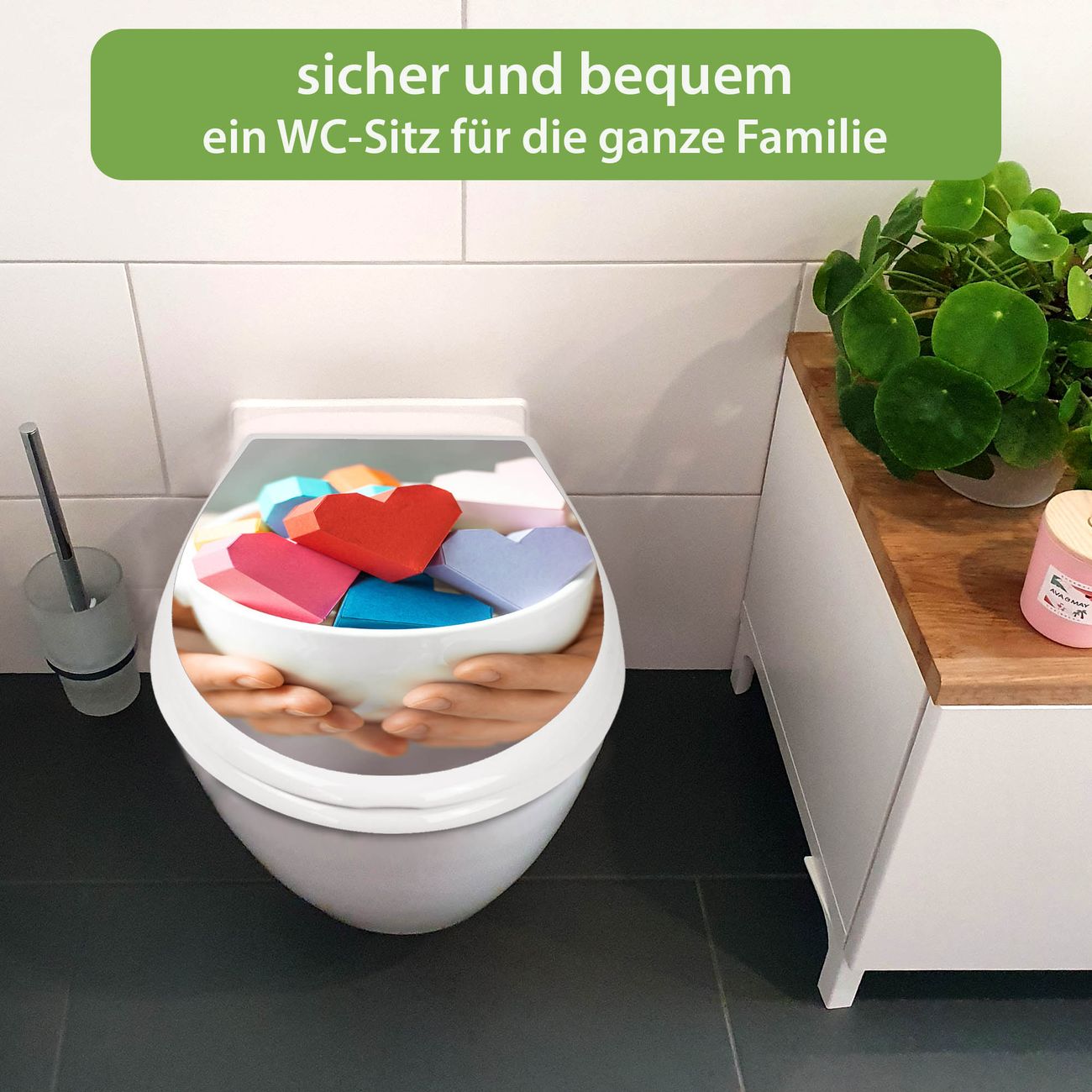 FUNKTION:Mit dem banjado Familien WC Sitz mit Absenkautomatik und dem Motiv Motiv Tasse voller Herzen verbinden Sie Design mit Funktionalität. Sie erhalten den Toilettendeckel in bewährt guter Qualität mit Montagematerial passend auf alle Euro-WC-Becken. Die Gesamtgröße beträgt 37,1cm x 44,9cm x 5cm, die Grundfarbe ist weiß.</p> DESIGN:Der Klodeckel in weiß mit Motiv Motiv Tasse voller Herzen hat eine ansprechende Optik, eine besondere Form und ist sehr stabil. Das Motiv besteht aus einer farbbrillianten Motivfolie, die durch ein Schutzlaminat zusätzlich vor Kratzern schützt. Der integrierte Kindersitz fügt sich harmonisch ein. DETAILS:Der Toilettensitz mit Soft Close besteht aus hochwertigem Polypropylen, ist geruchlos, ungiftig und kann mit handelsüblicher Seife gereinigt werden. Die Montage kann von von oben oder von unten erfolgen und ist kinderleicht. NUTZEN:Mit Hilfe der detaillierten Aufbauanleitung ermöglichen wir eine schnelle und unkomplizierte Montage. Die banjado Klobrille ist universell geeignet für alle Euro-WC-Schüsseln. Der Kindersitz kann unkompliziert entfernt werden. BANJADO:Ihr WC-Deckel wird in Sachsen in einer kleinen Manufaktur von Hand veredelt. Die Motivfolie ist lösungsmittelfrei und schutzlaminiert für einen langen Halt. Wir wünschen viel Freude bei der Auswahl eines schönen Motivs.