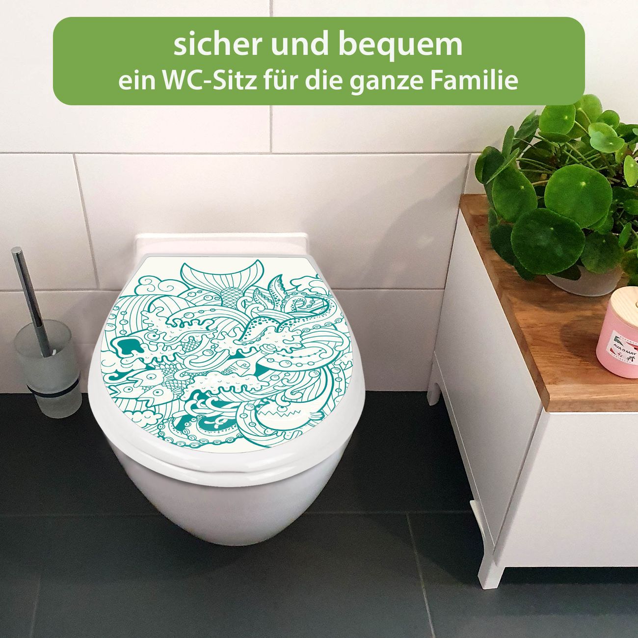 FUNKTION:Mit dem banjado Familien WC Sitz mit Absenkautomatik und dem Motiv Motiv Tiefsee verbinden Sie Design mit Funktionalität. Sie erhalten den Toilettendeckel in bewährt guter Qualität mit Montagematerial passend auf alle Euro-WC-Becken. Die Gesamtgröße beträgt 37,1cm x 44,9cm x 5cm, die Grundfarbe ist weiß.</p> DESIGN:Der Klodeckel in weiß mit Motiv Motiv Tiefsee hat eine ansprechende Optik, eine besondere Form und ist sehr stabil. Das Motiv besteht aus einer farbbrillianten Motivfolie, die durch ein Schutzlaminat zusätzlich vor Kratzern schützt. Der integrierte Kindersitz fügt sich harmonisch ein. DETAILS:Der Toilettensitz mit Soft Close besteht aus hochwertigem Polypropylen, ist geruchlos, ungiftig und kann mit handelsüblicher Seife gereinigt werden. Die Montage kann von von oben oder von unten erfolgen und ist kinderleicht. NUTZEN:Mit Hilfe der detaillierten Aufbauanleitung ermöglichen wir eine schnelle und unkomplizierte Montage. Die banjado Klobrille ist universell geeignet für alle Euro-WC-Schüsseln. Der Kindersitz kann unkompliziert entfernt werden. BANJADO:Ihr WC-Deckel wird in Sachsen in einer kleinen Manufaktur von Hand veredelt. Die Motivfolie ist lösungsmittelfrei und schutzlaminiert für einen langen Halt. Wir wünschen viel Freude bei der Auswahl eines schönen Motivs.