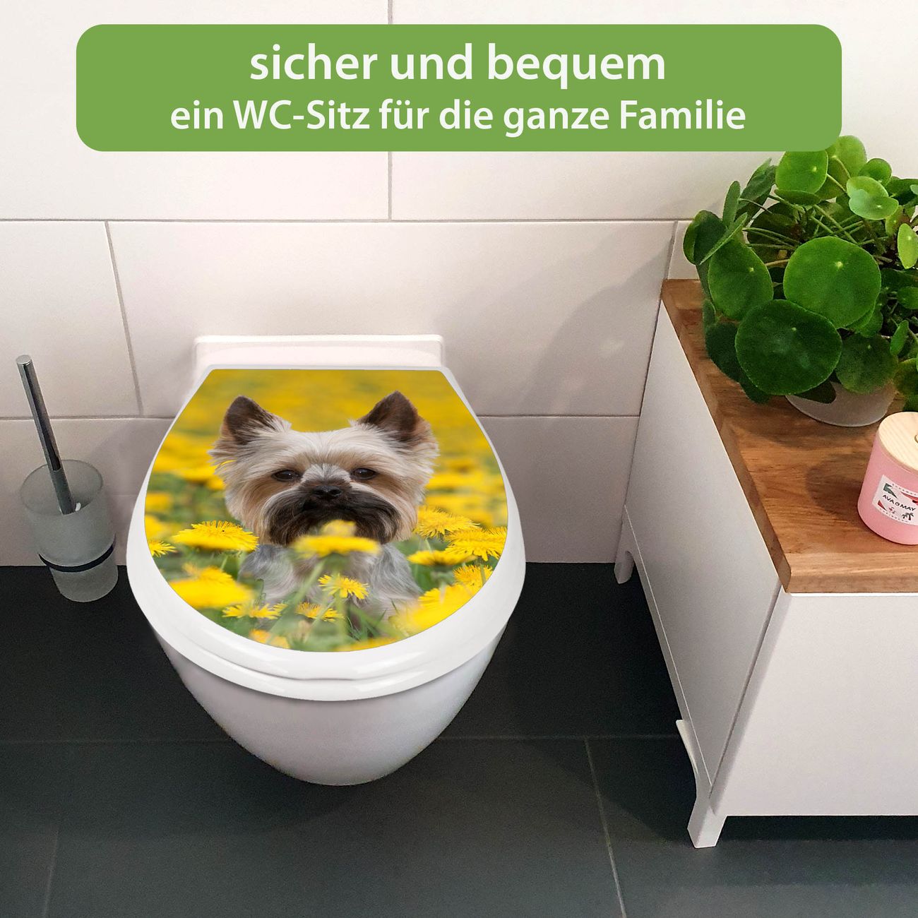 FUNKTION:Mit dem banjado Familien WC Sitz mit Absenkautomatik und dem Motiv Motiv Tiffy verbinden Sie Design mit Funktionalität. Sie erhalten den Toilettendeckel in bewährt guter Qualität mit Montagematerial passend auf alle Euro-WC-Becken. Die Gesamtgröße beträgt 37,1cm x 44,9cm x 5cm, die Grundfarbe ist weiß.</p> DESIGN:Der Klodeckel in weiß mit Motiv Motiv Tiffy hat eine ansprechende Optik, eine besondere Form und ist sehr stabil. Das Motiv besteht aus einer farbbrillianten Motivfolie, die durch ein Schutzlaminat zusätzlich vor Kratzern schützt. Der integrierte Kindersitz fügt sich harmonisch ein. DETAILS:Der Toilettensitz mit Soft Close besteht aus hochwertigem Polypropylen, ist geruchlos, ungiftig und kann mit handelsüblicher Seife gereinigt werden. Die Montage kann von von oben oder von unten erfolgen und ist kinderleicht. NUTZEN:Mit Hilfe der detaillierten Aufbauanleitung ermöglichen wir eine schnelle und unkomplizierte Montage. Die banjado Klobrille ist universell geeignet für alle Euro-WC-Schüsseln. Der Kindersitz kann unkompliziert entfernt werden. BANJADO:Ihr WC-Deckel wird in Sachsen in einer kleinen Manufaktur von Hand veredelt. Die Motivfolie ist lösungsmittelfrei und schutzlaminiert für einen langen Halt. Wir wünschen viel Freude bei der Auswahl eines schönen Motivs.